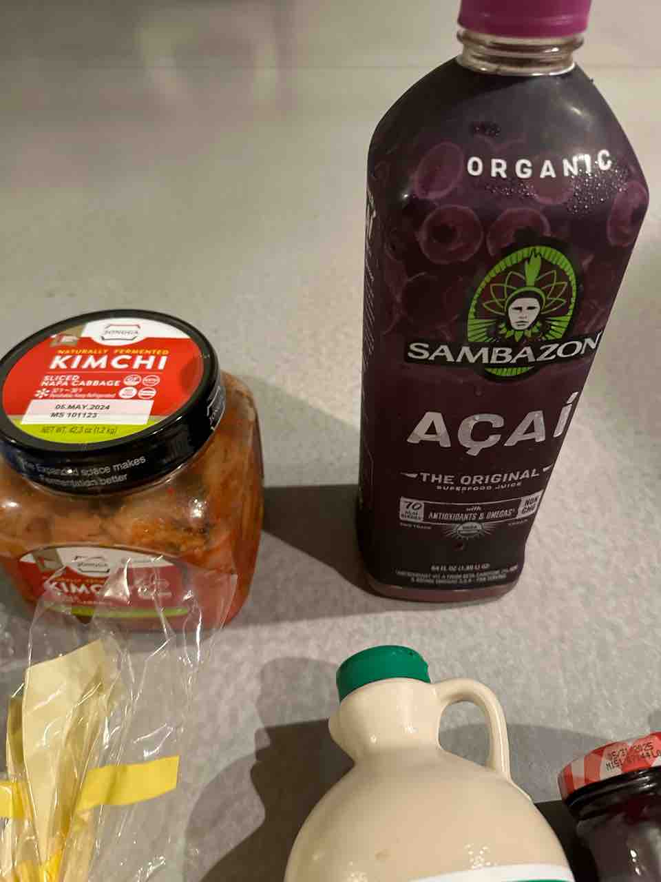 夫のアサイージュースと、私のキムチ。