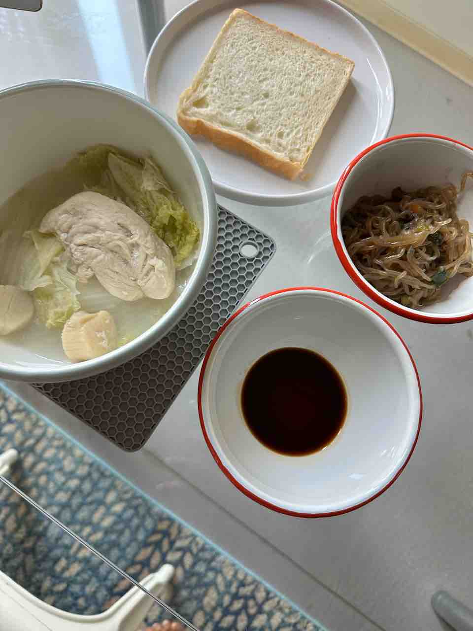 ランチは鶏胸肉と白菜とホタテを蒸したやつ、白滝炒め、食パン1枚(8枚切り)という謎の組み合わせ。