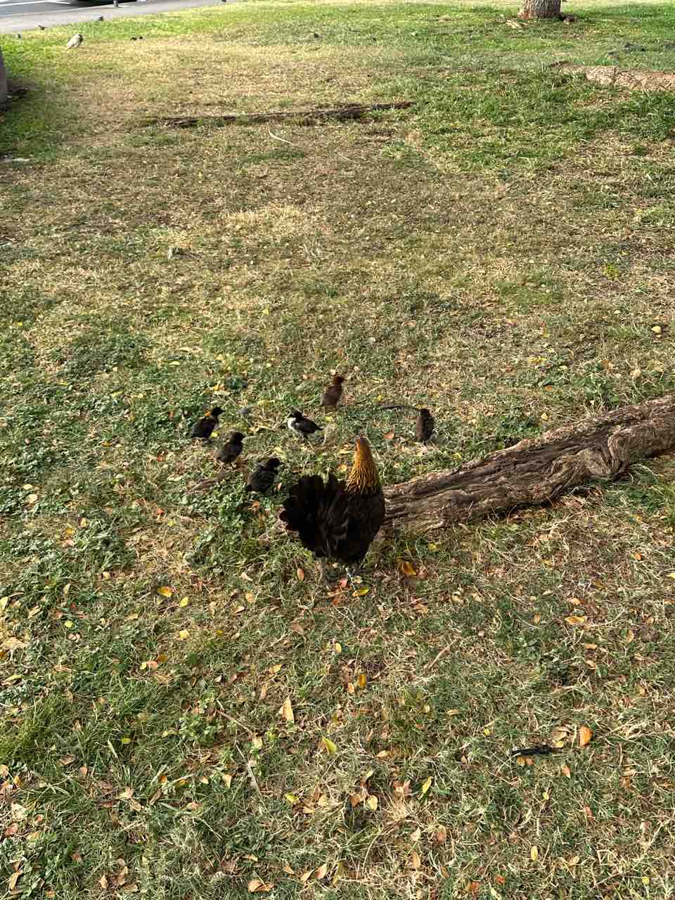 帰りに、ここ最近見守っている鶏親子を。黒ひよこさん可愛い。