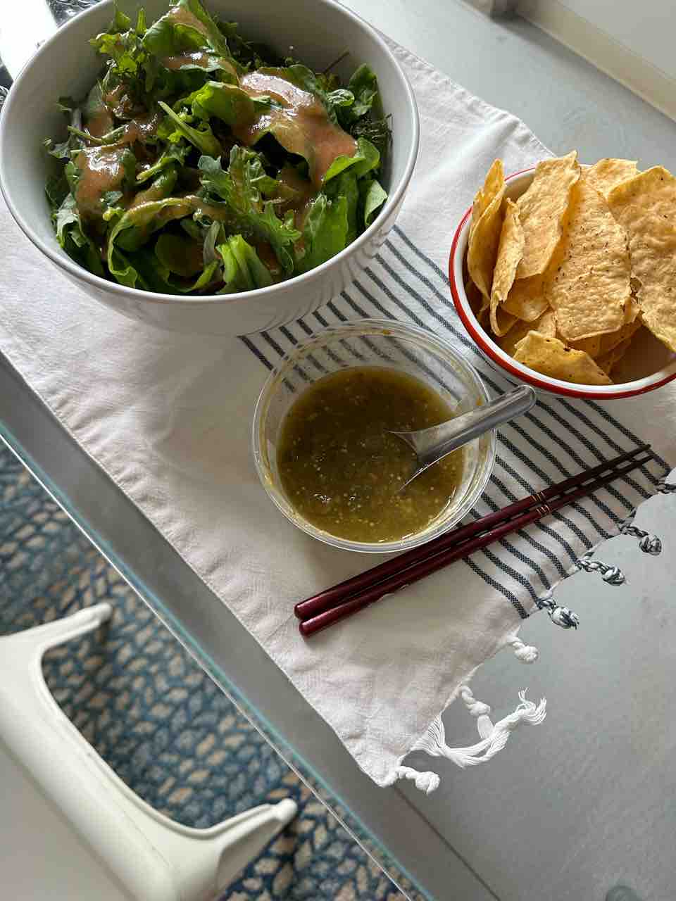 夫のポットラックの残りのコーントルティーヤと、サルサ。
