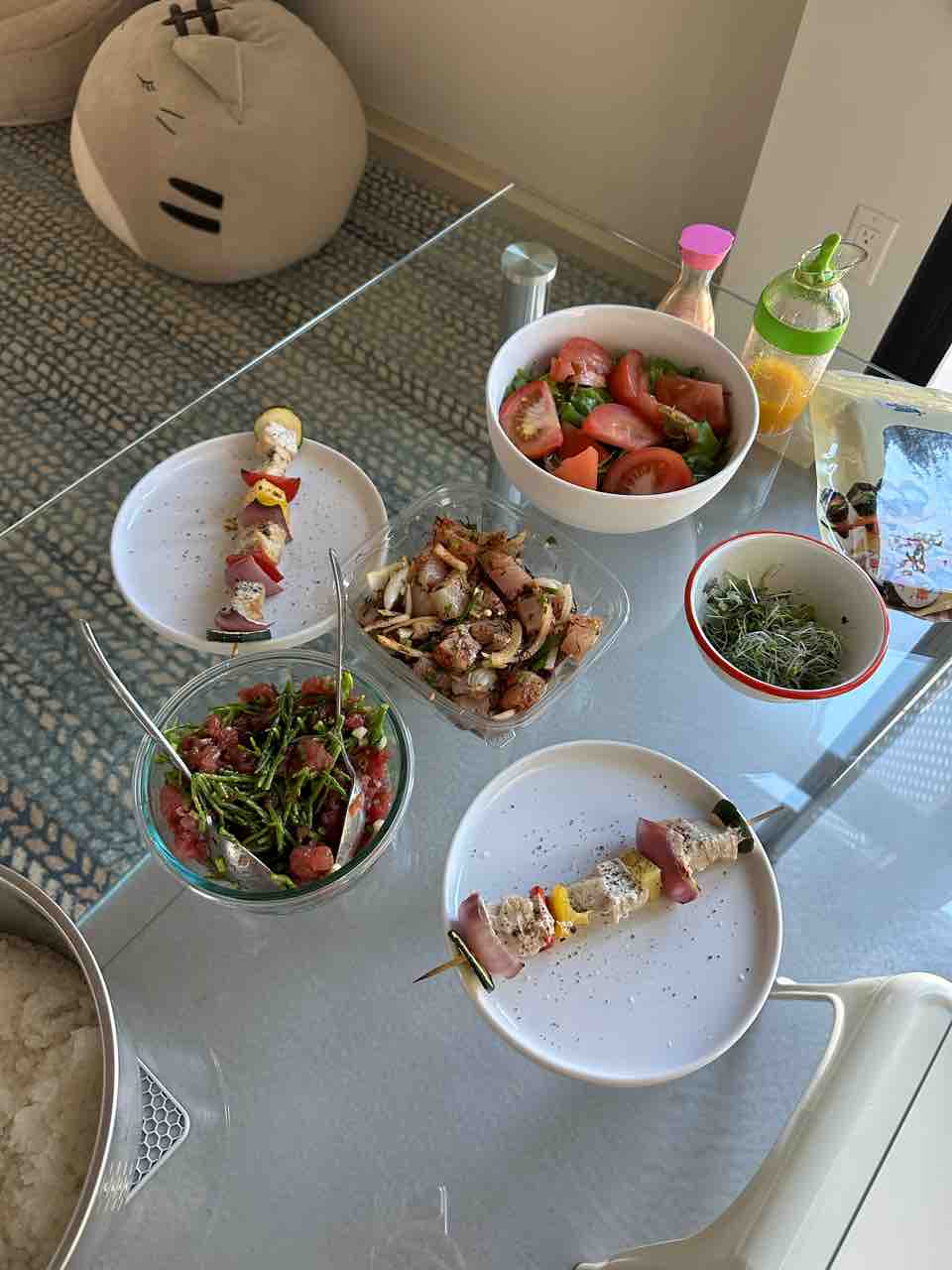 マグロの中落ちはポケみたいにして、カジキのポケと、メカジキの串焼き。