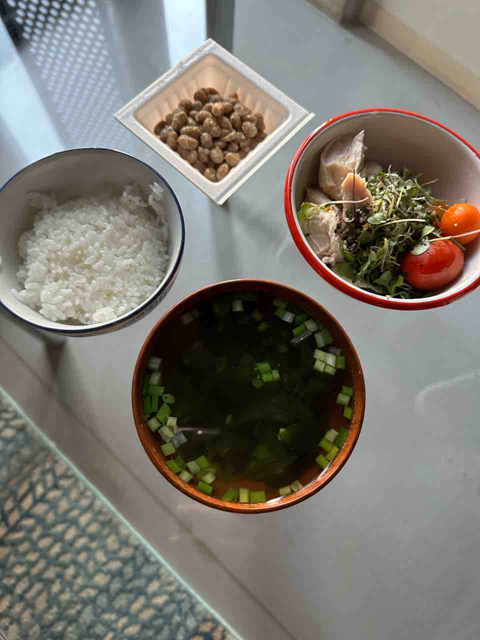 白米100gに、納豆、鶏胸肉とマイクログリーンとミニトマト、鶏出汁スープにネギとワカメ。