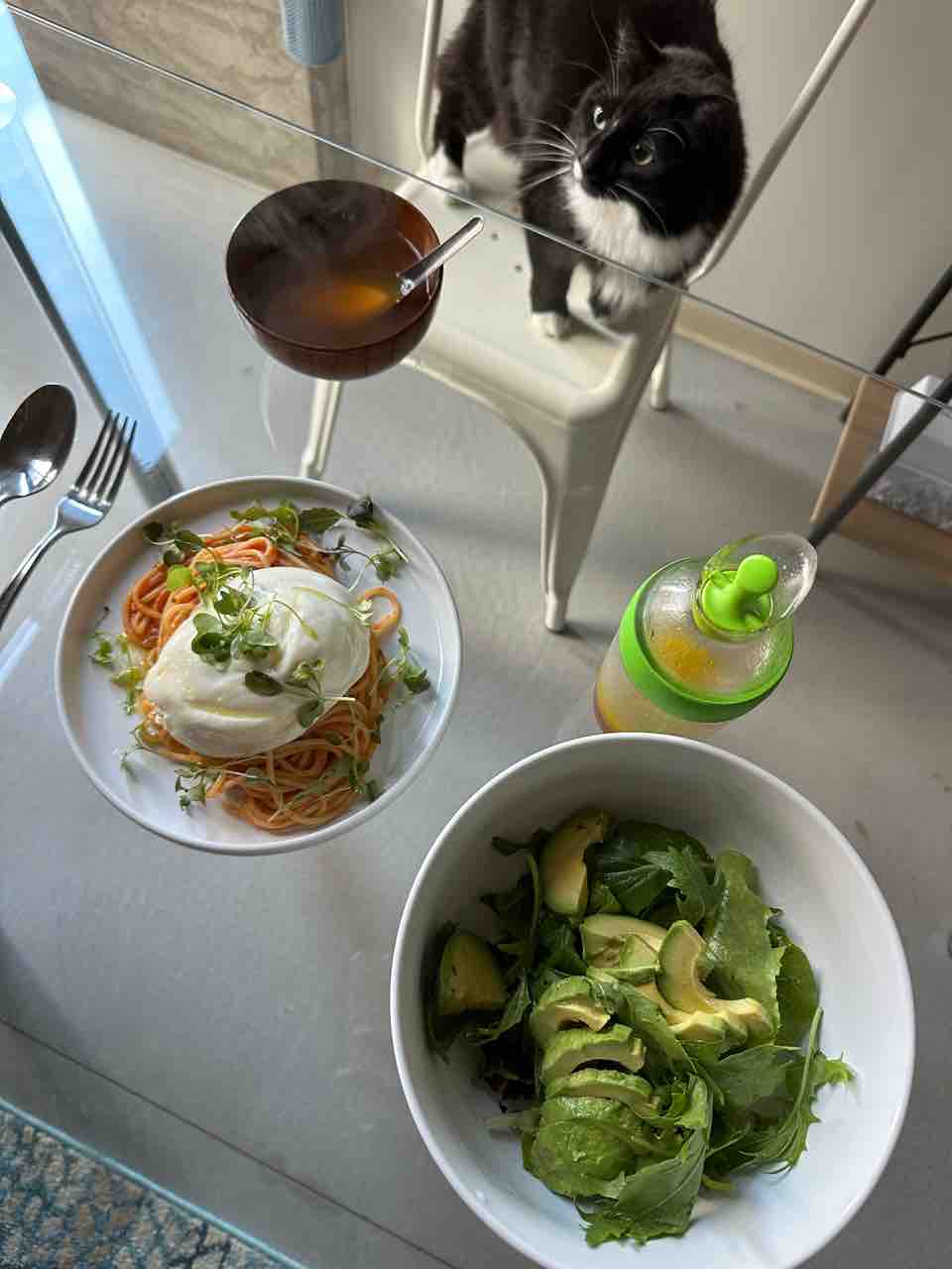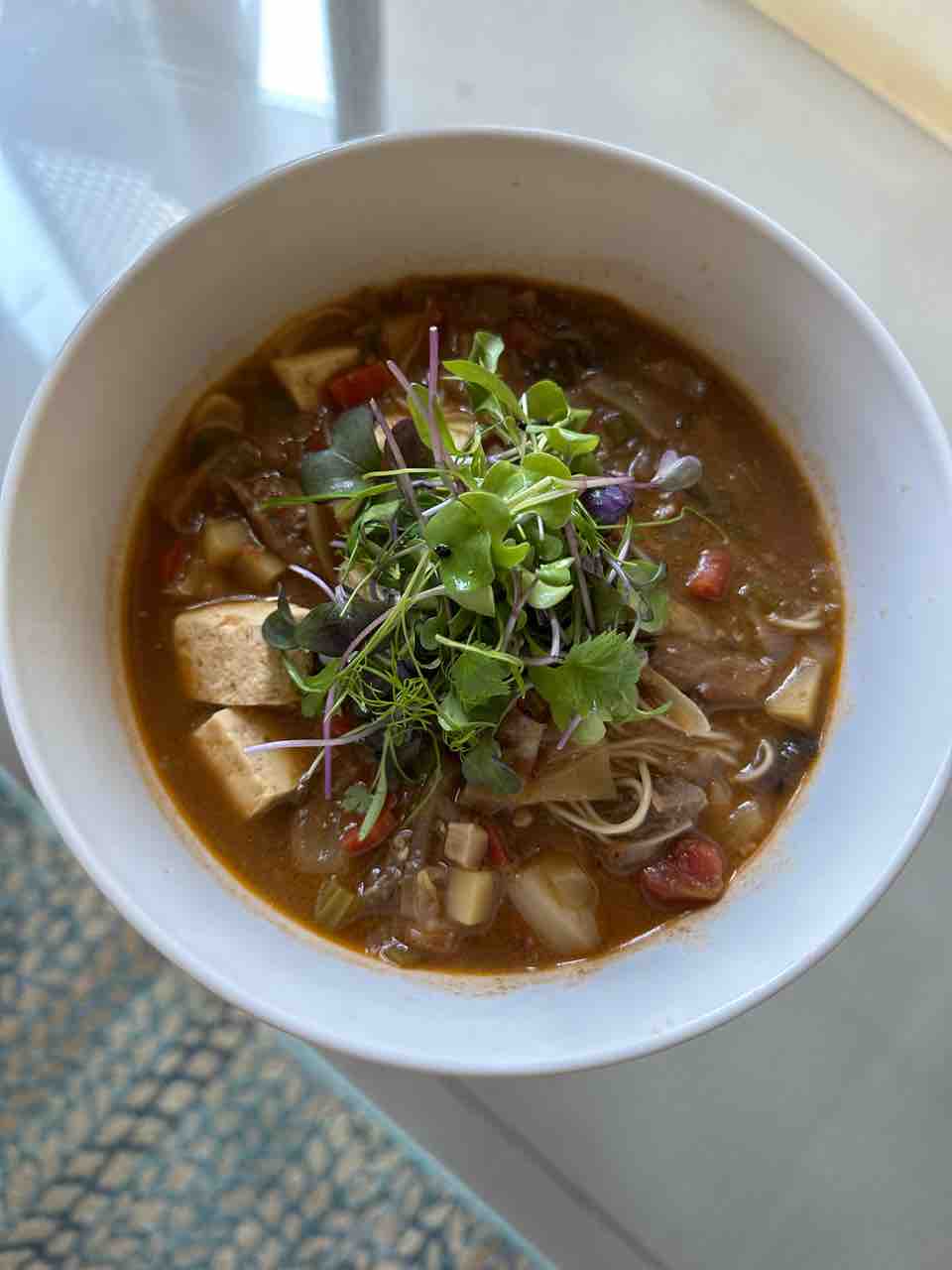 ランチは残っていた野菜スープに素麺と豆腐を入れたやつ。