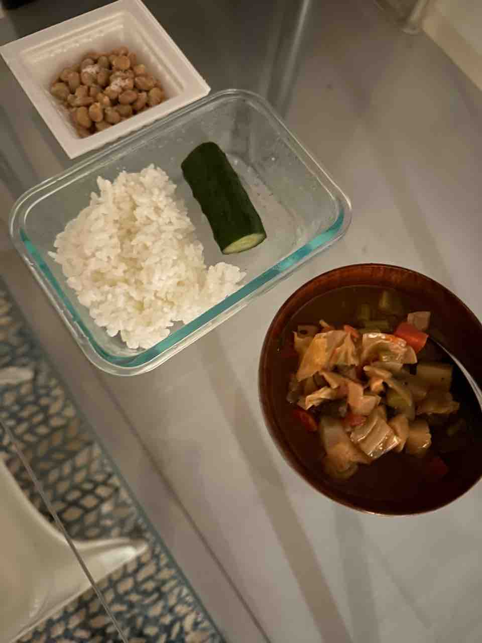 昨日の朝ごはんは納豆、糠漬け、白米、野菜スープ!