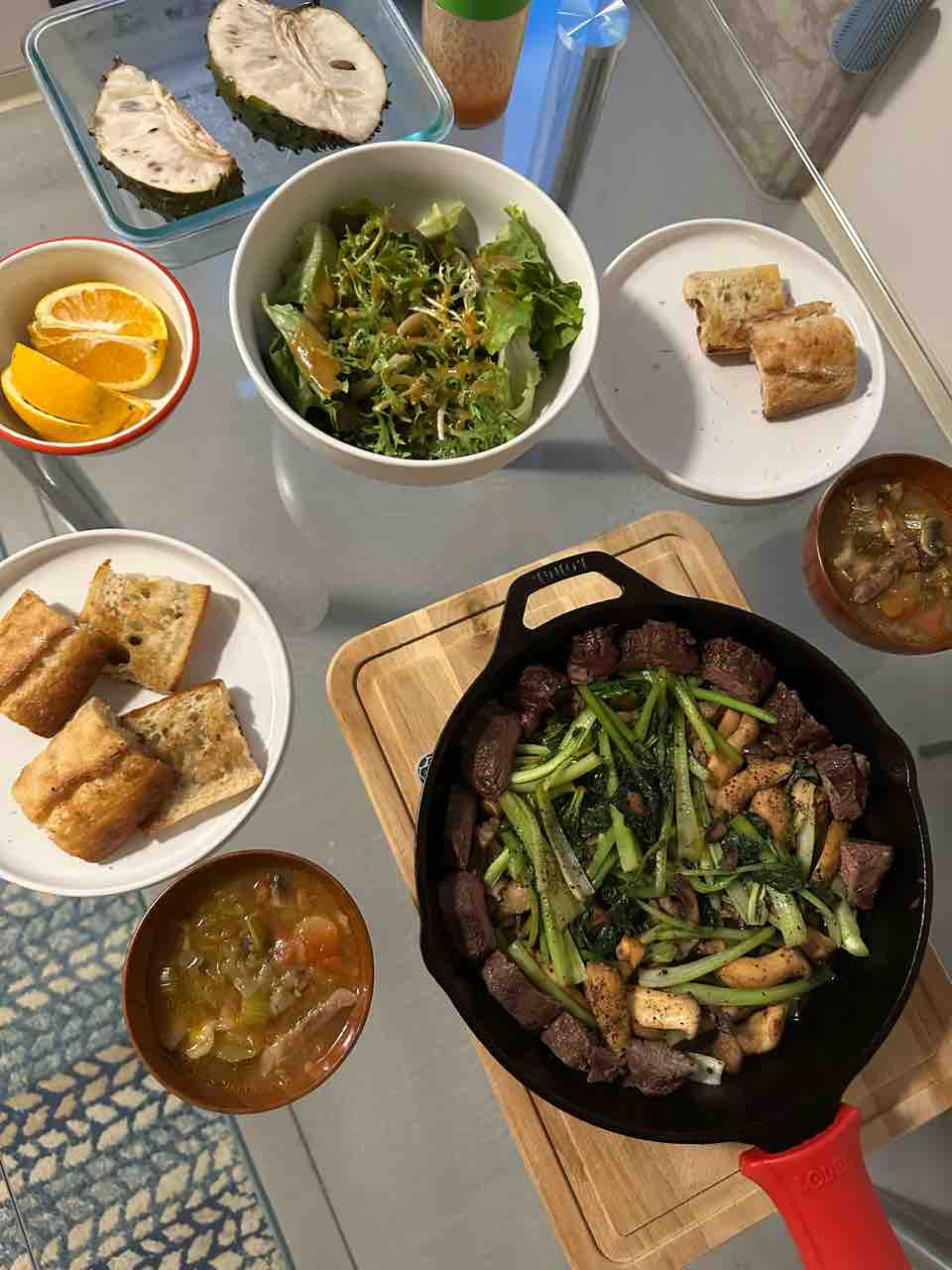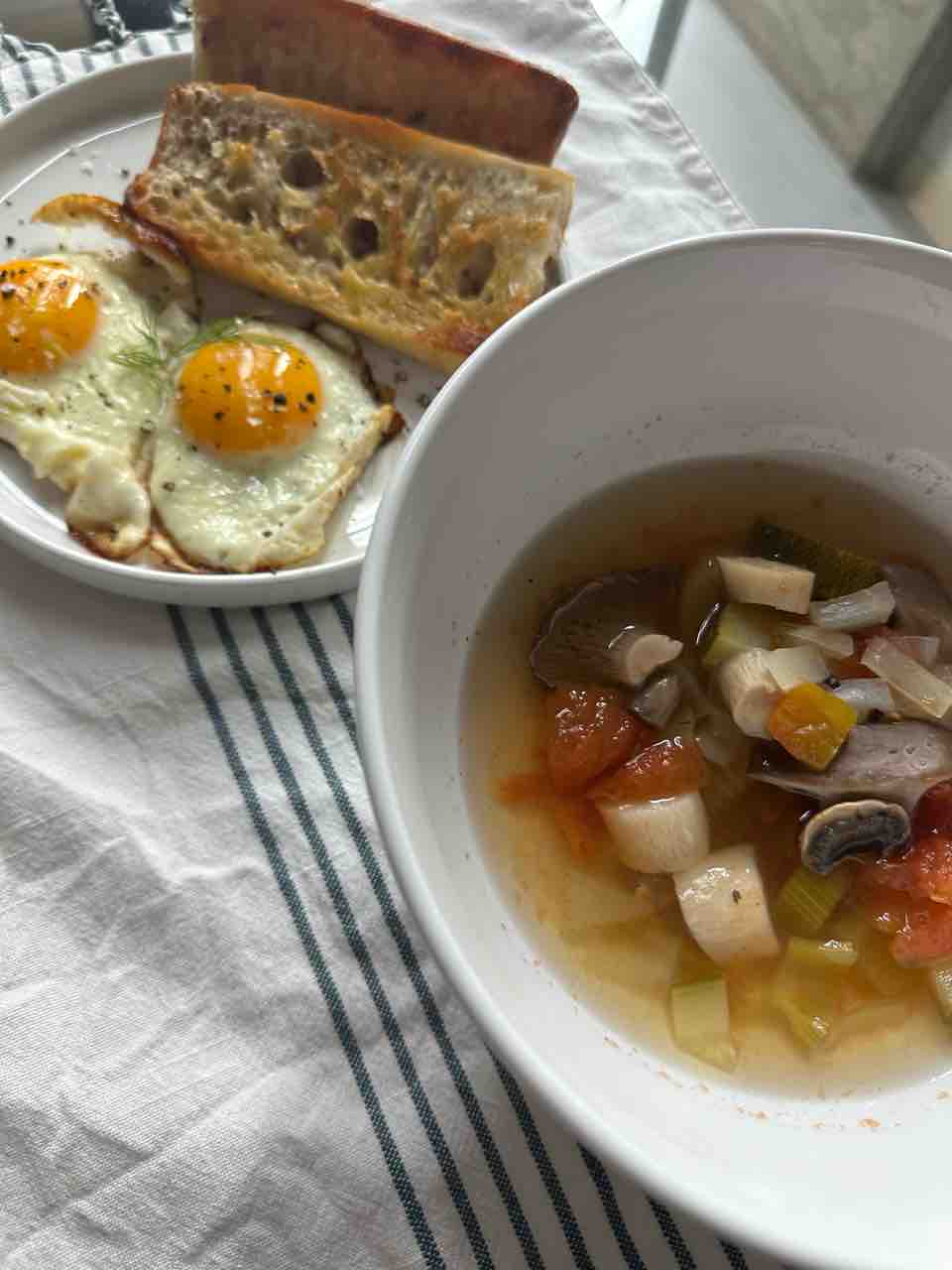 きのことTatsoiっていう野菜(タアサイ?)を炒めたやつ。野菜スープ。