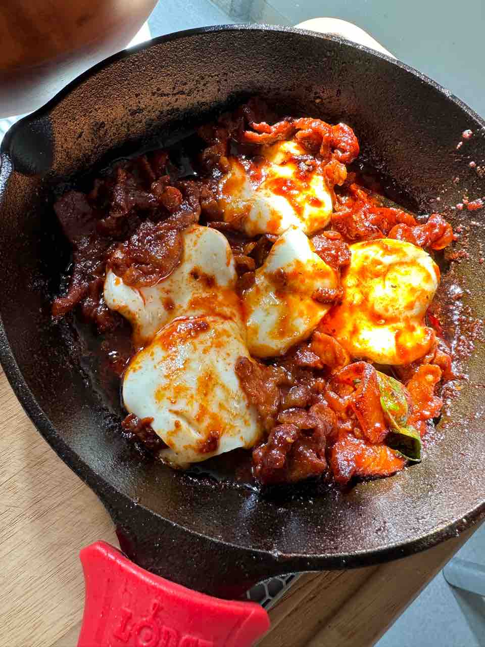 ポークは焼いてみたら、むせるぐらい、ものっすごく辛い匂いがして「こりゃやばい」と思って余ってた水牛チーズを投入したんだけど…