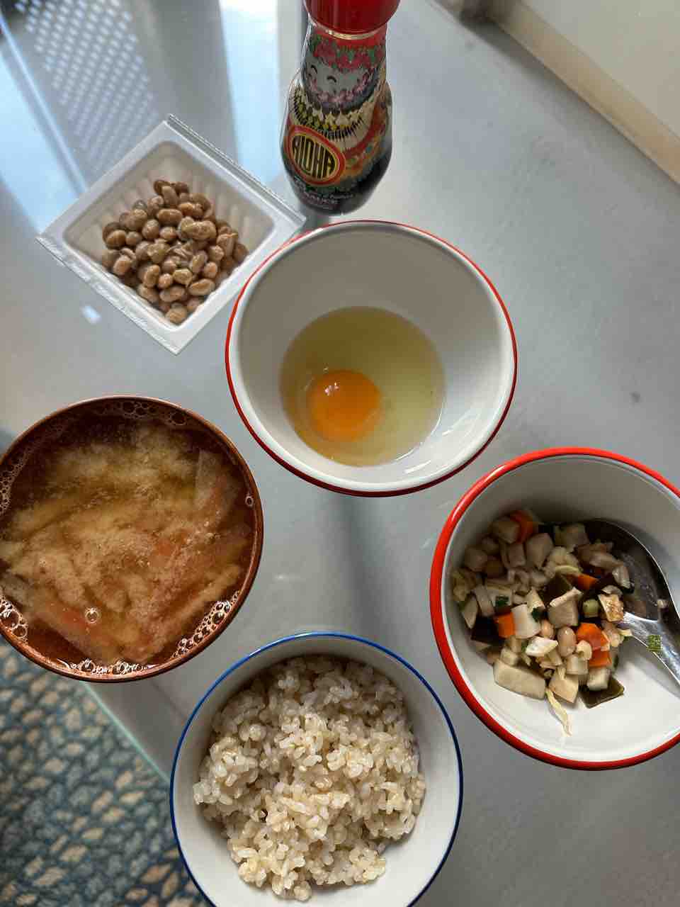 昨日の朝ごはんはスイカのお味噌汁に、玄米と、糠漬け、生卵と納豆!