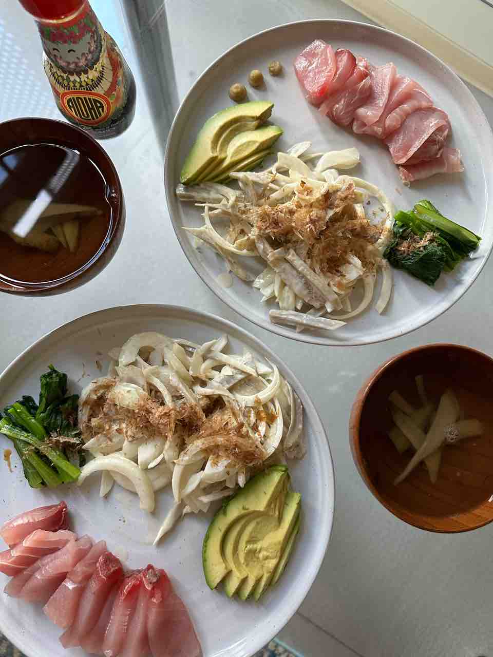 夜ご飯はカジキのお刺身と、牛蒡と玉ねぎのサラダなど。
