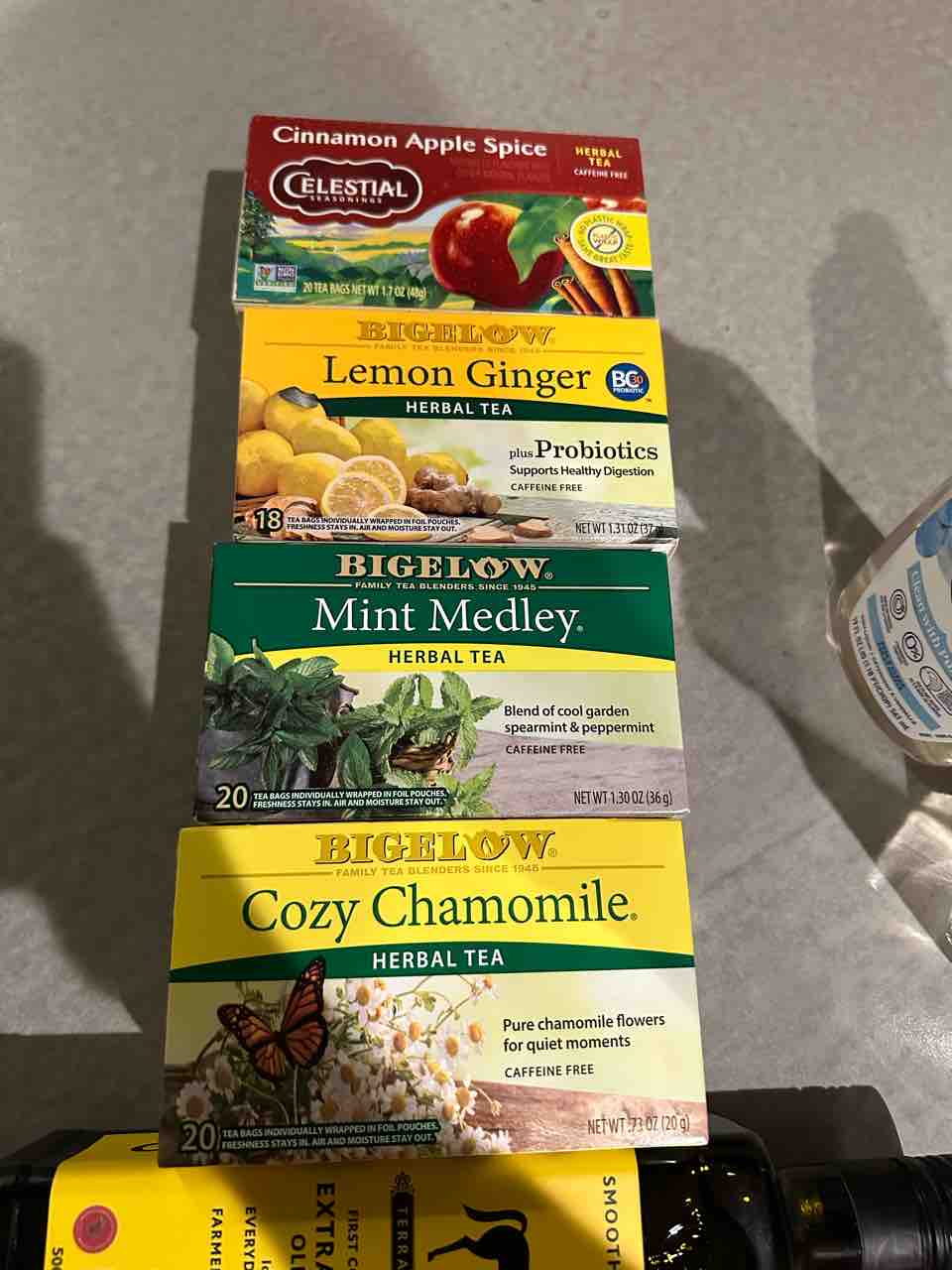 食器用洗剤とオリーブオイル、ハーブティー各種。