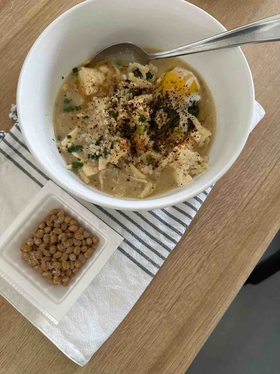 玄米80gに、豆腐と切り干し大根、わかめ、卵の雑炊。