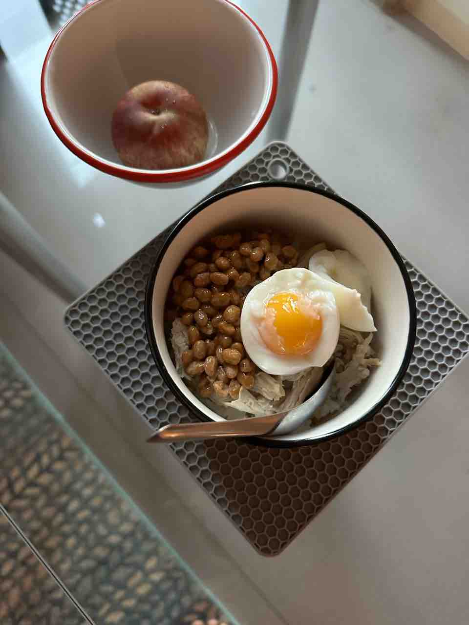 昨日の朝ごはんはチキンライスに、納豆とゆで卵。
