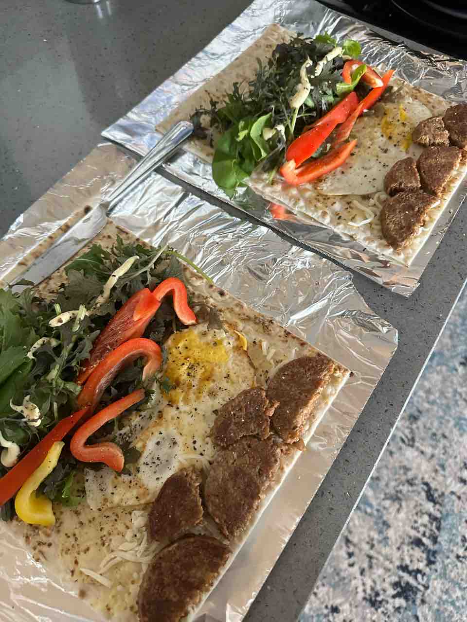 無料で手に入れた植物性のパテ(そんなに美味しくない)と、卵、モッツァレラチーズ、野菜を載せて巻き巻き。