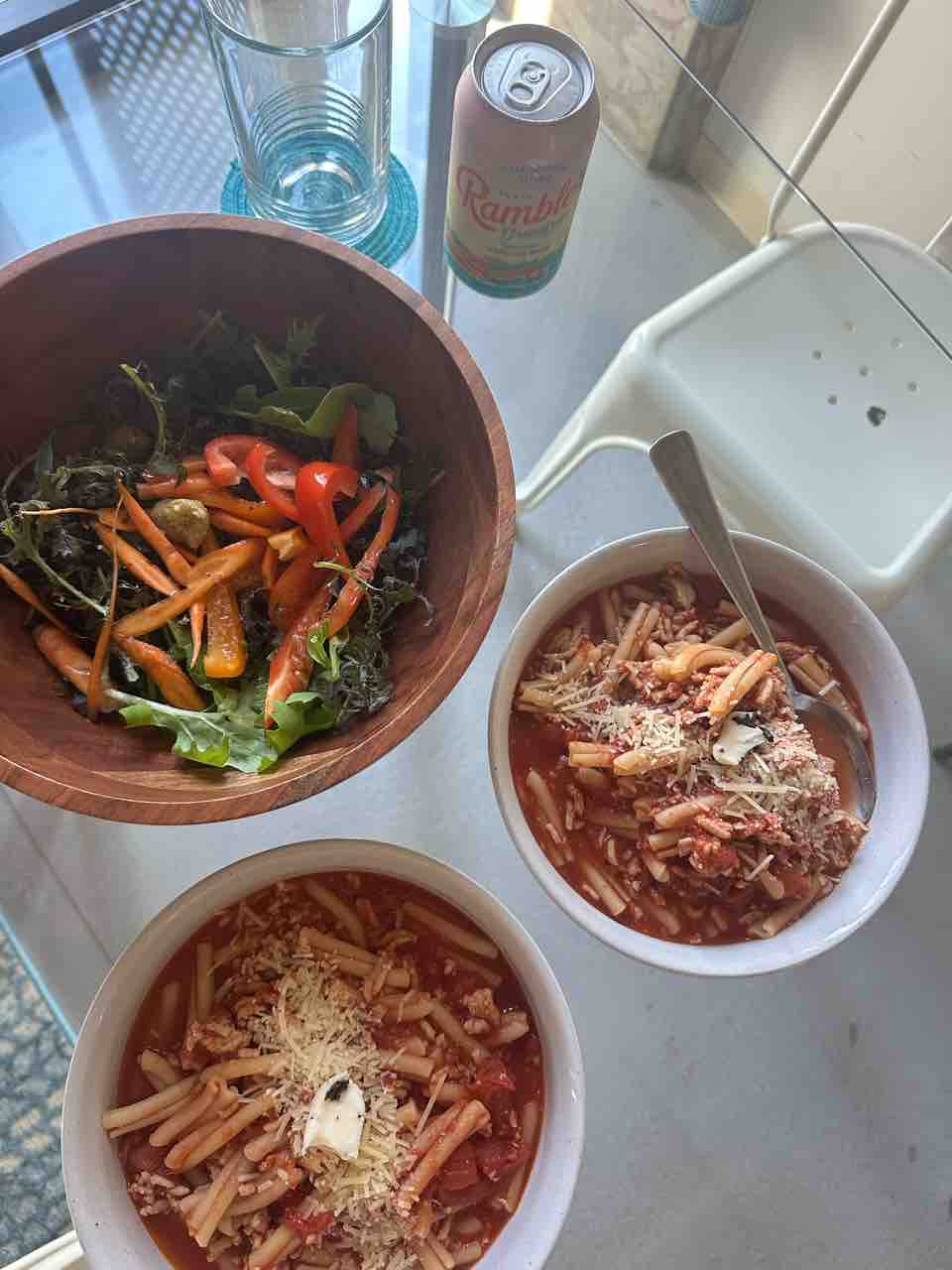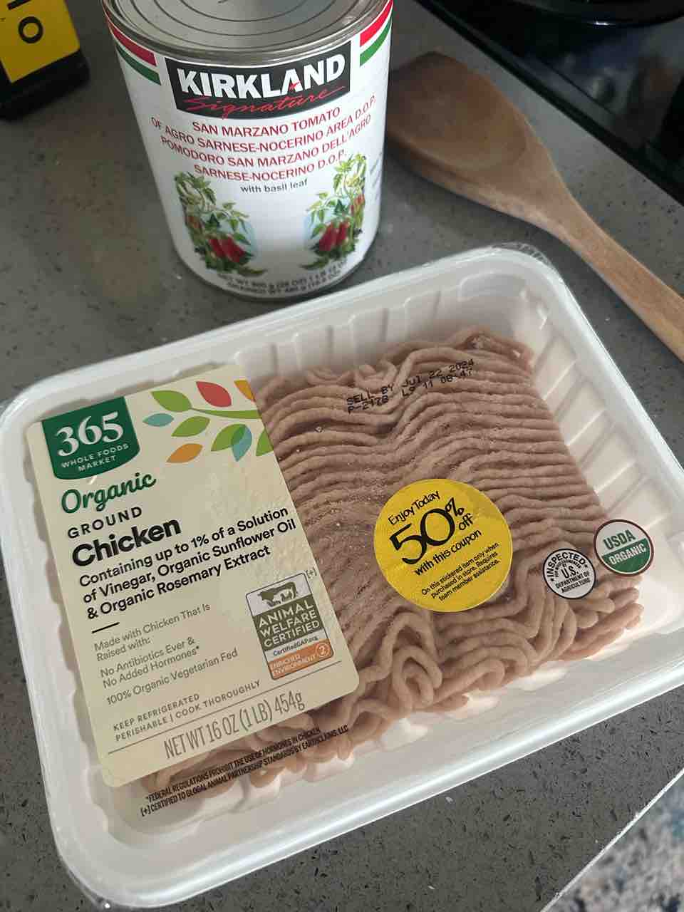 夜ご飯は、以前50%オフで買って冷凍しておいた鶏ひき肉と、コストコの美味しいトマト缶でパスタにっ。