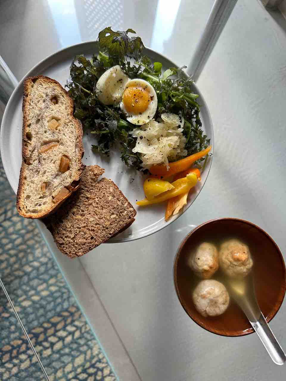 昨日の朝ごはんは、サラダに卵、味噌パパイヤ胡桃サワードウにライ麦パン。