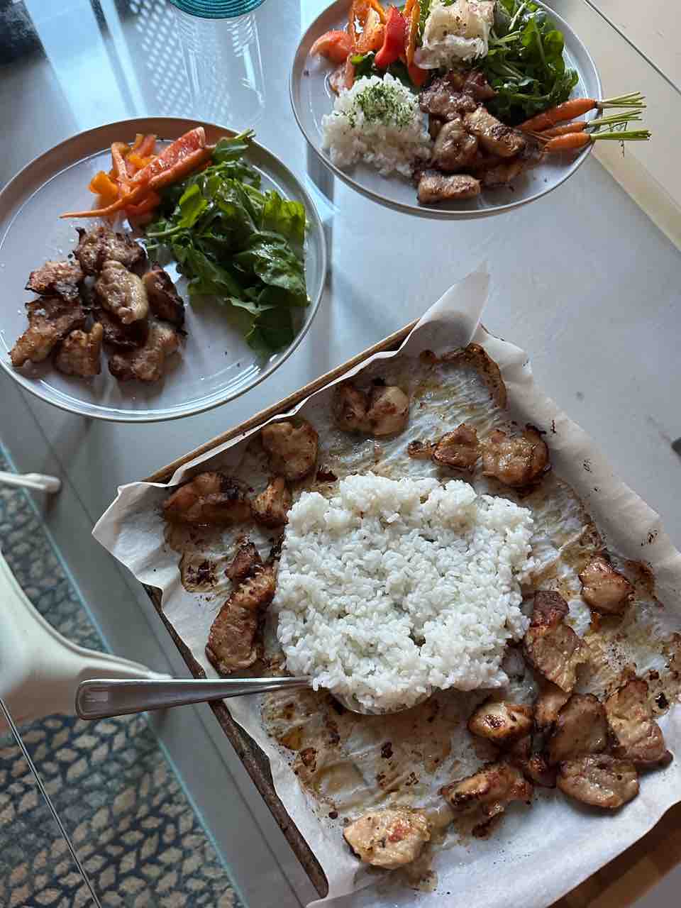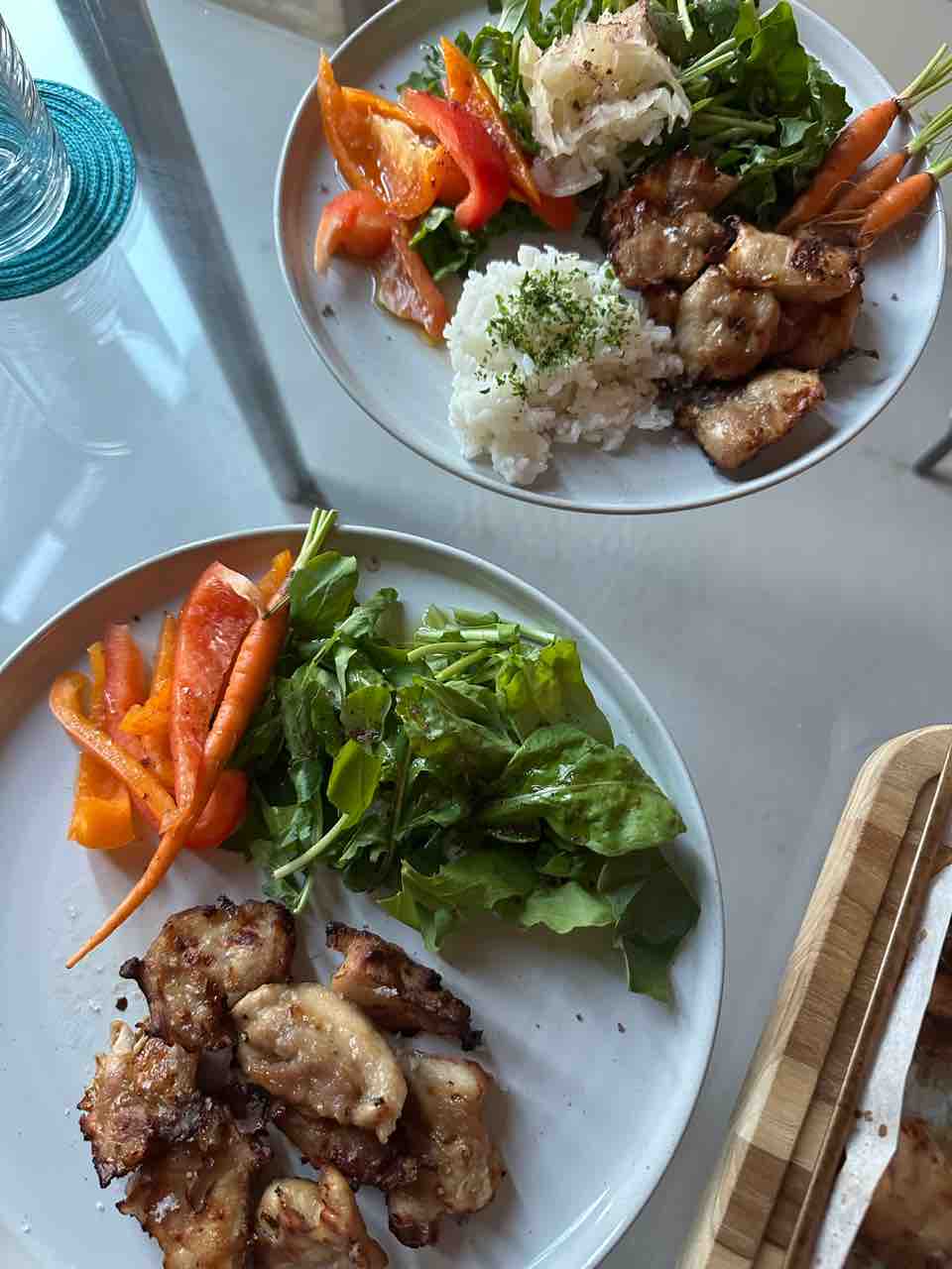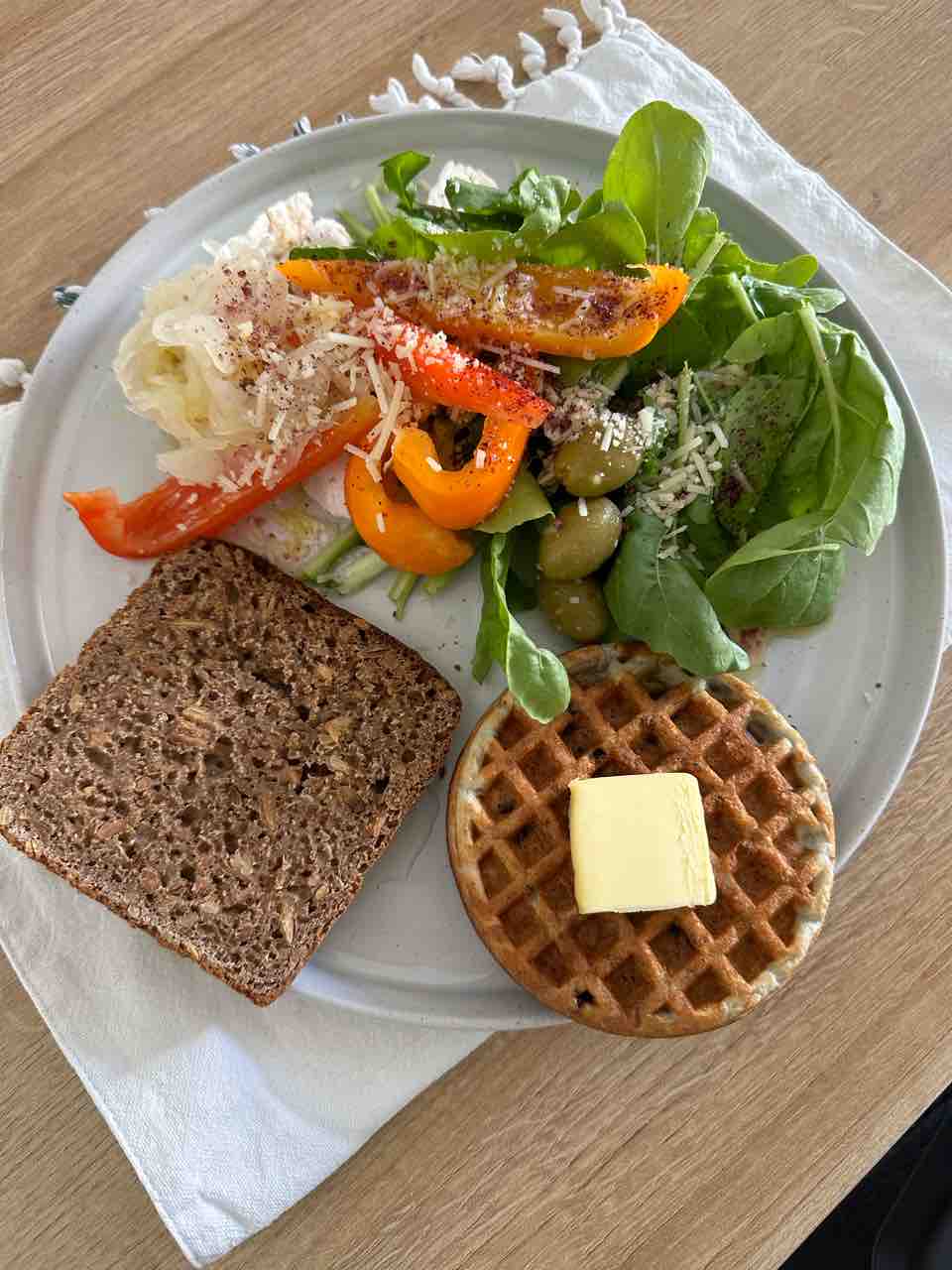 朝ごはんは鶏胸肉とアルグラのサラダと、ライ麦パン、グルテンフリーワッフル+グラスフェッドバター。