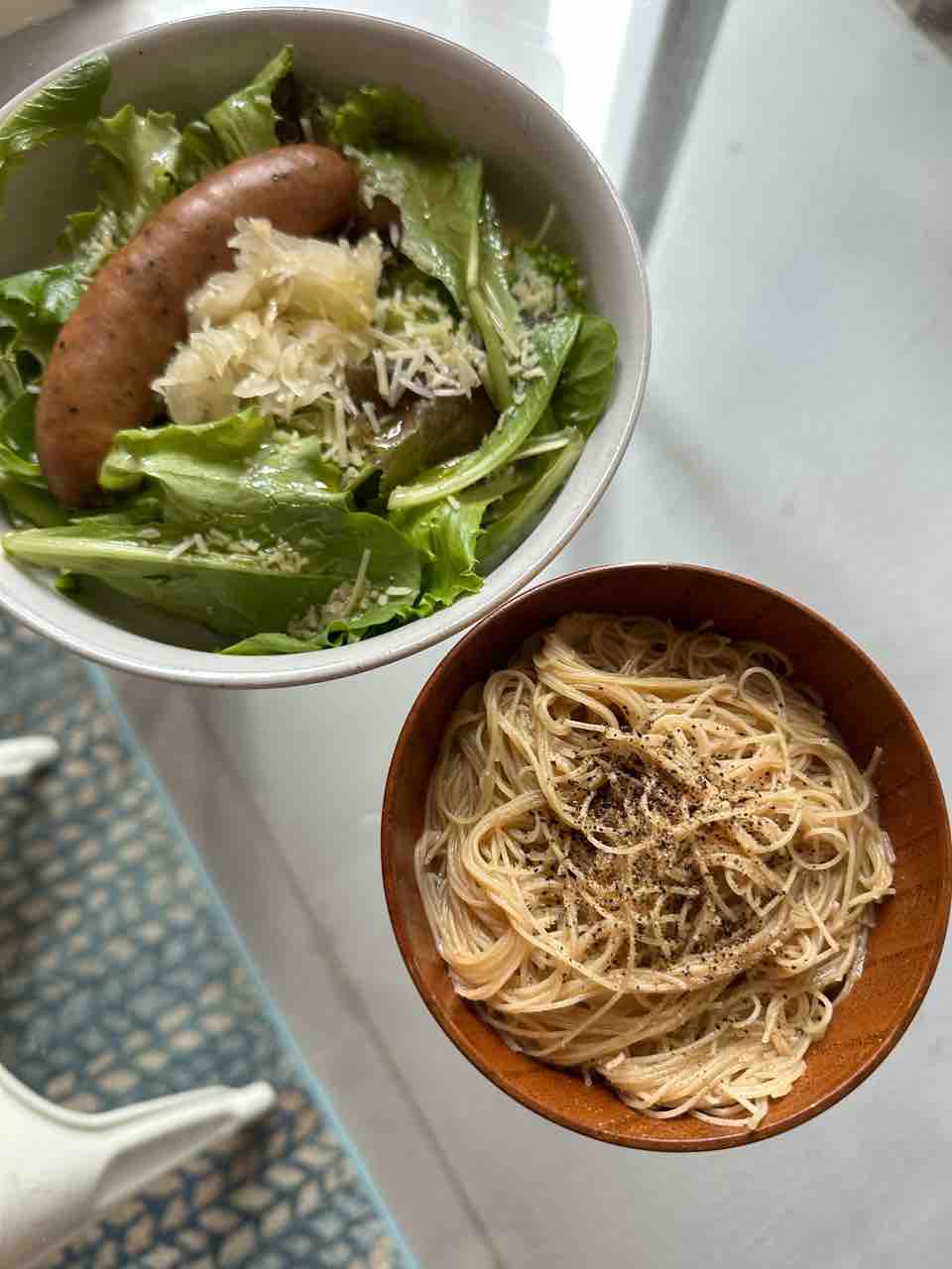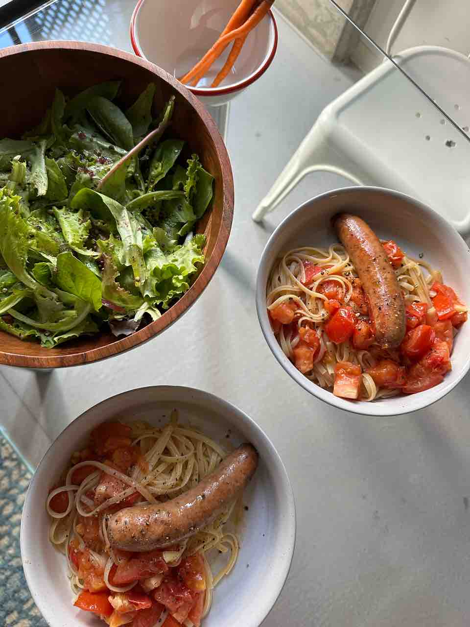 ディナーはニンジンの糠漬けと、サラダと、チキンソーセージのパスタっ