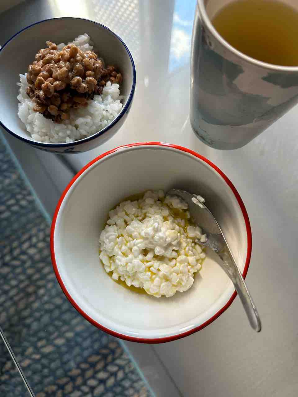 朝は緑茶に納豆ご飯と、カッテージチーズとエキストラバージンオリーブオイル。