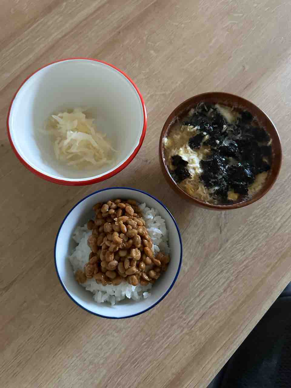 朝ごはんは念願の白米納豆に、卵と海苔の味噌汁、ザワークラウト。