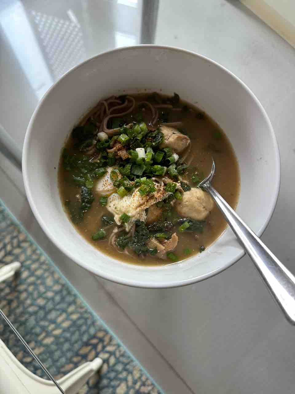 いろんなキノコと、ほうれん草と、とり肉団子と卵を入れて。