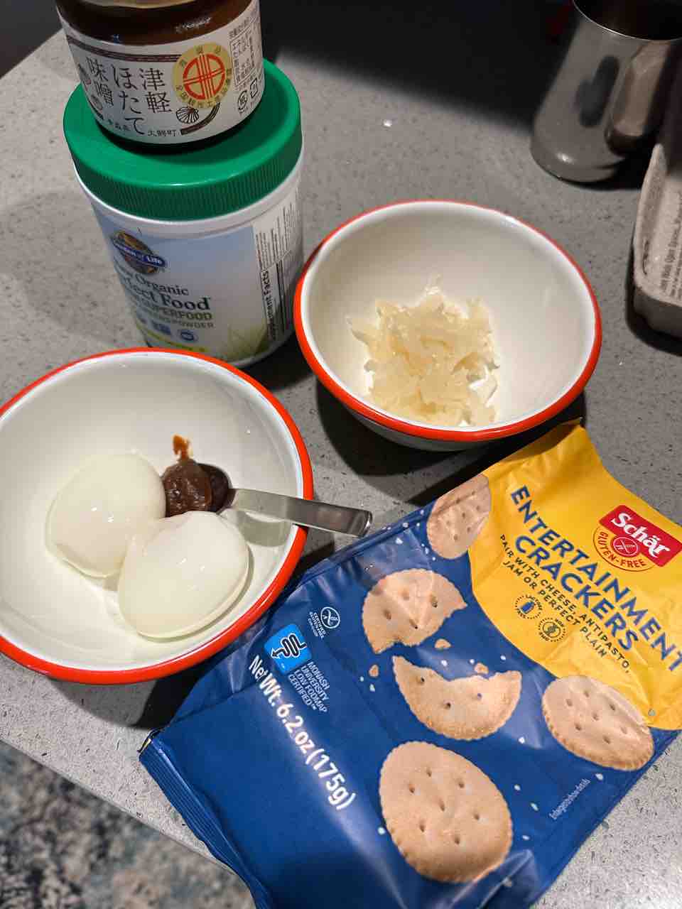 青汁、ゆで卵とホタテ味噌、ザワークラウト、グルテンフリークラッカー。