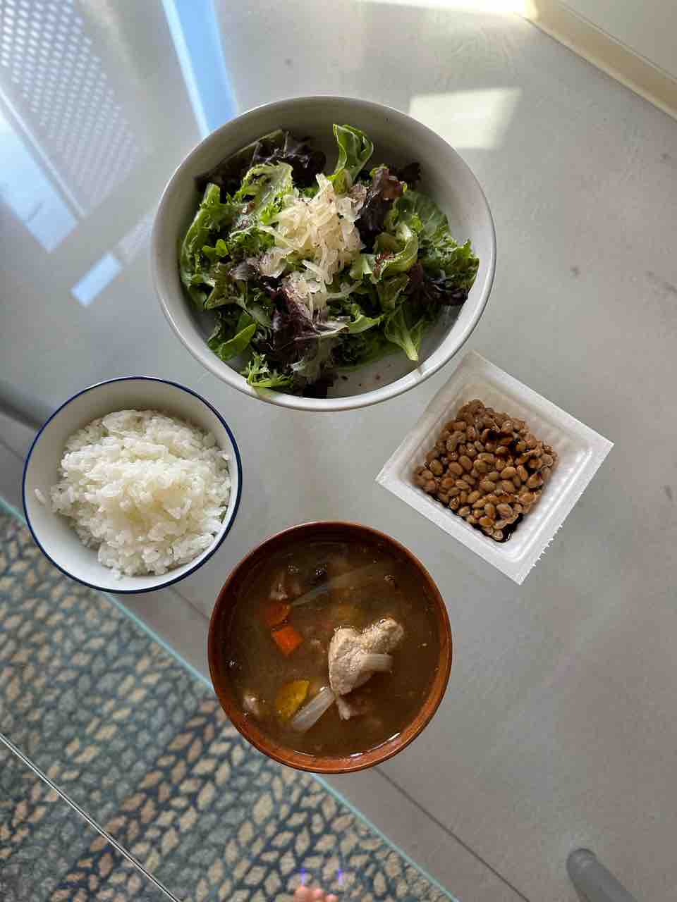 豚汁もどき、納豆、葉っぱとザワークラウトのサラダ、白米。
