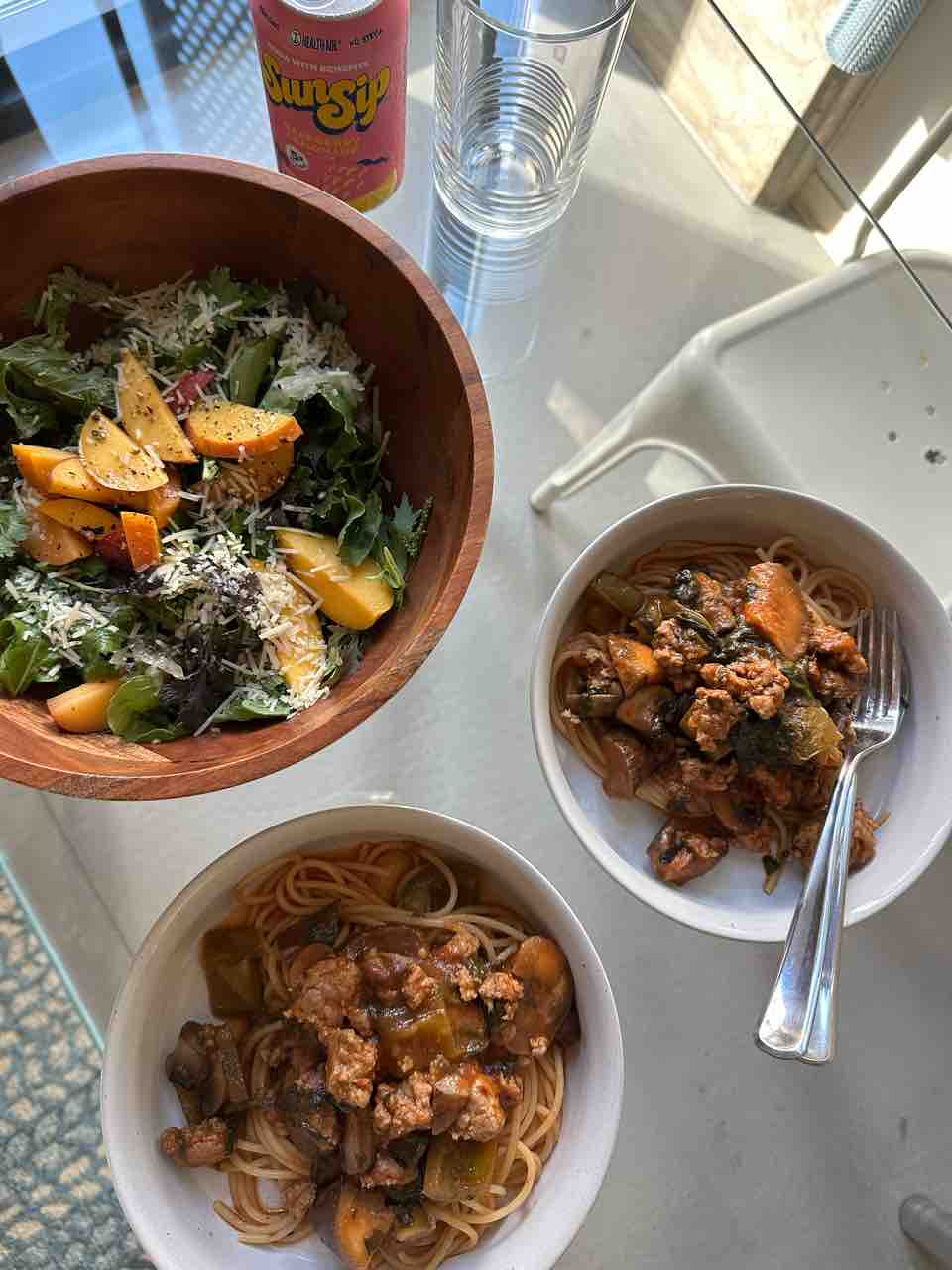 さてさて、そして昨日のディナーは、50%で手に入れて冷凍していたポークソーセージに野菜を大量に入れてパスタっ。