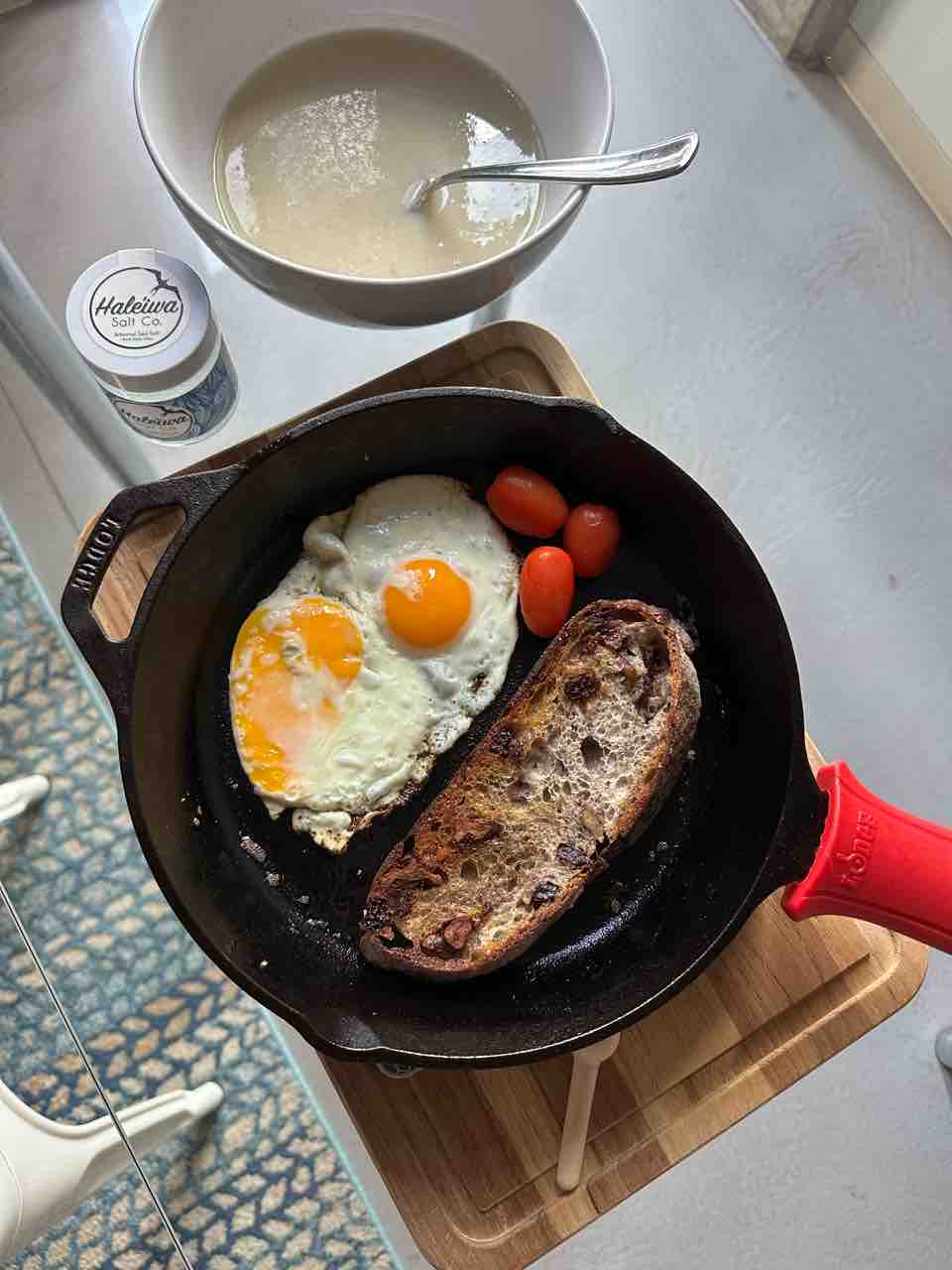 朝は白野菜のポタージュに、グラスフェッドバターで焼いたWallflourのパンと卵。