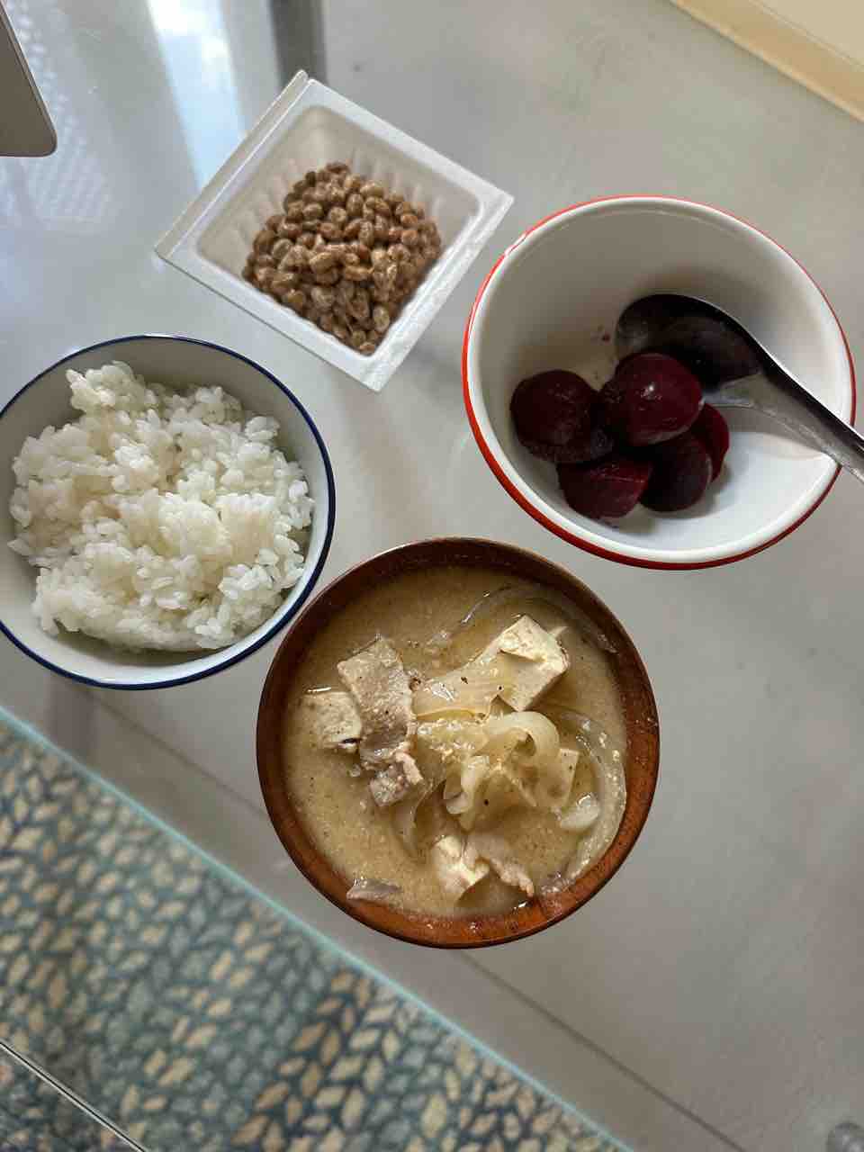 ランチは白米と納豆、ビーツ、豚汁もどき!