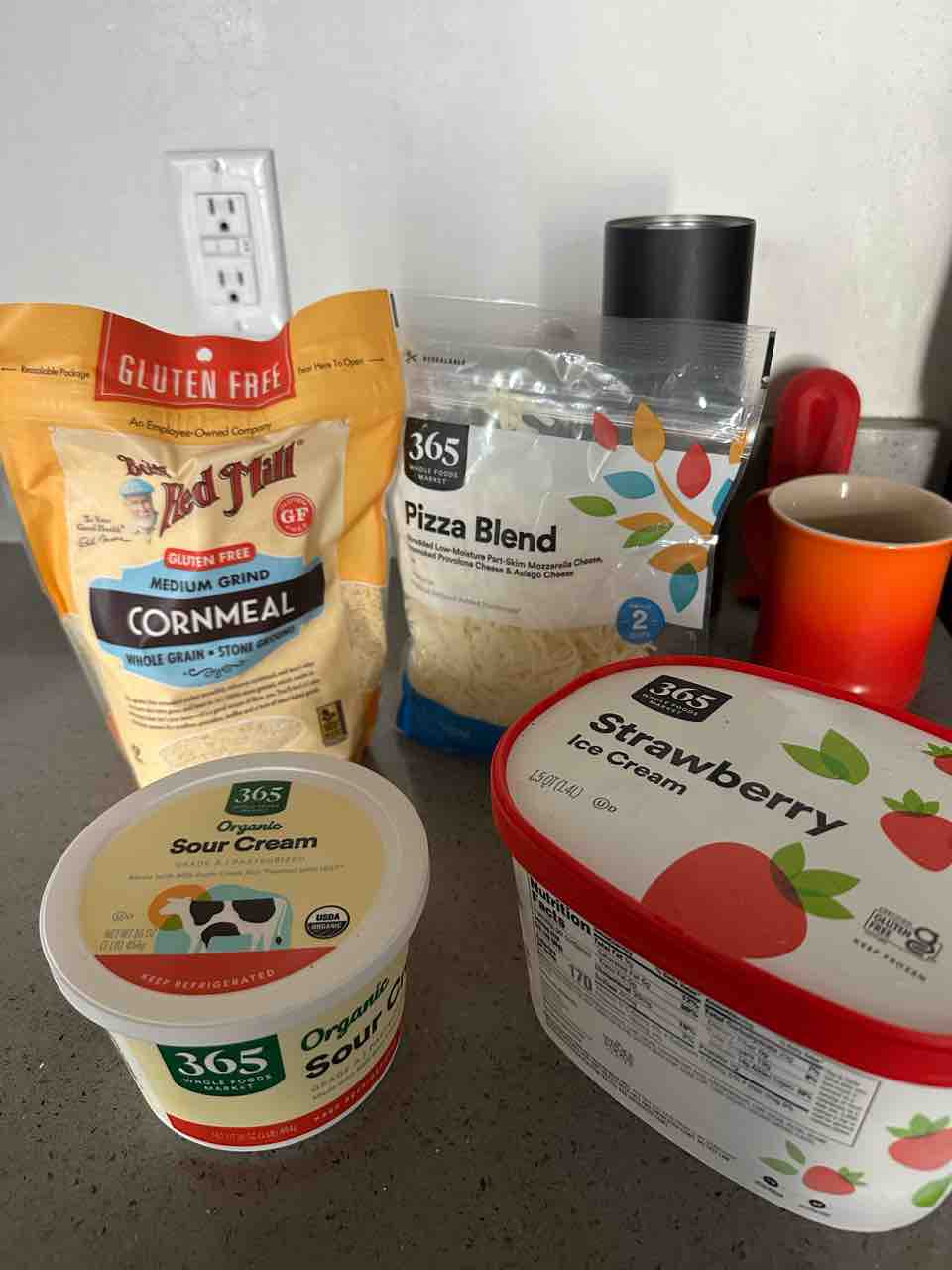 ラザニア作ろうと思って買ってきたチーズ、コーンブレッドを作ろうと思って買ってきたコーンミールとサワークリーム、それから勢いで買ってしまったアイスクリーム。