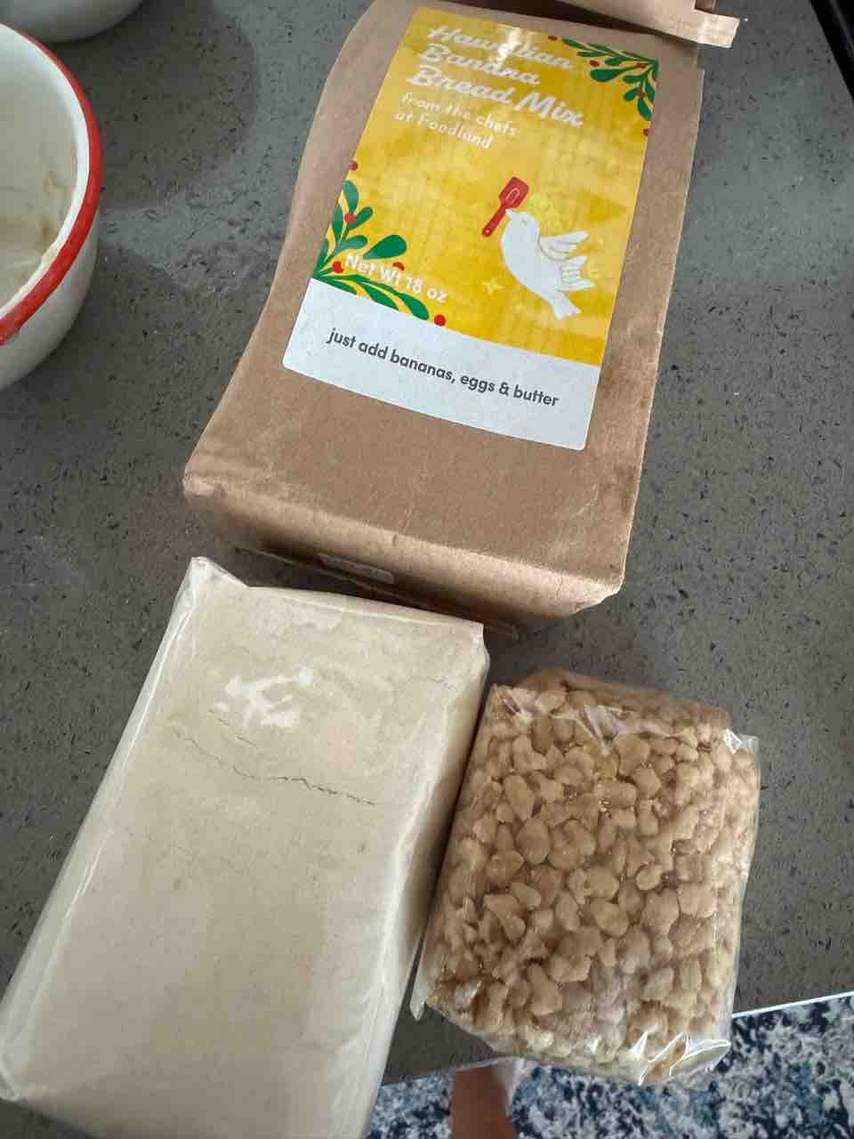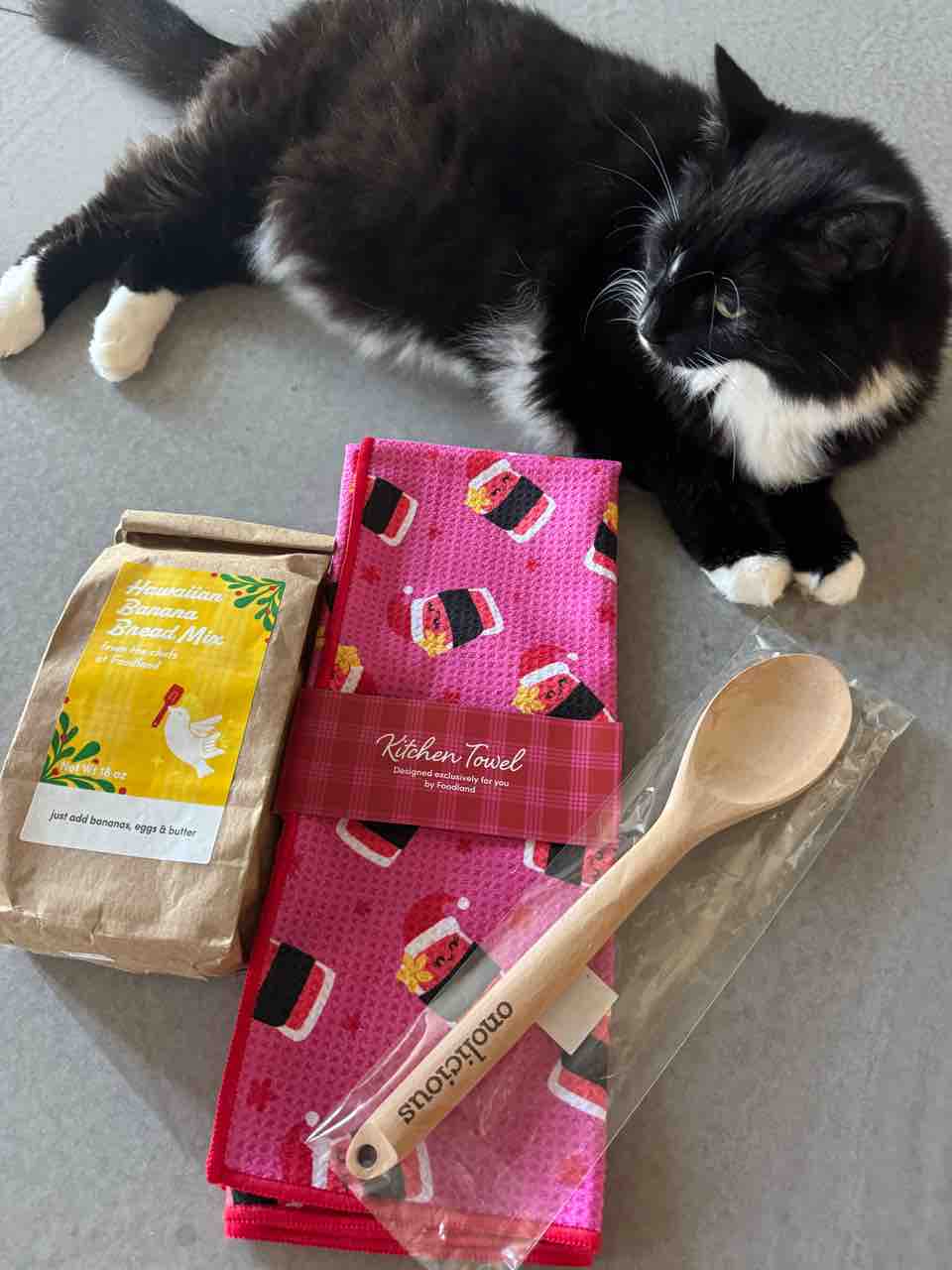 バナナブレッドのミックスと、サンタクローススパムのキッチンタオル、onoliciousって書いてある木べら!