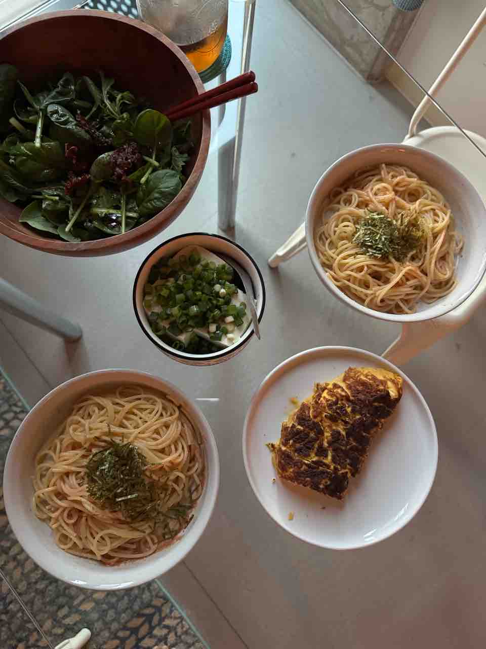 それからターサイのサラダと、グリーンオニオンと魚醤の冷奴、卵5個使った卵焼き!
