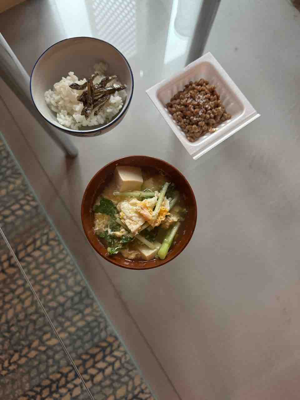 納豆とおせちの小魚と白米、水菜と豆腐と卵の味噌汁。