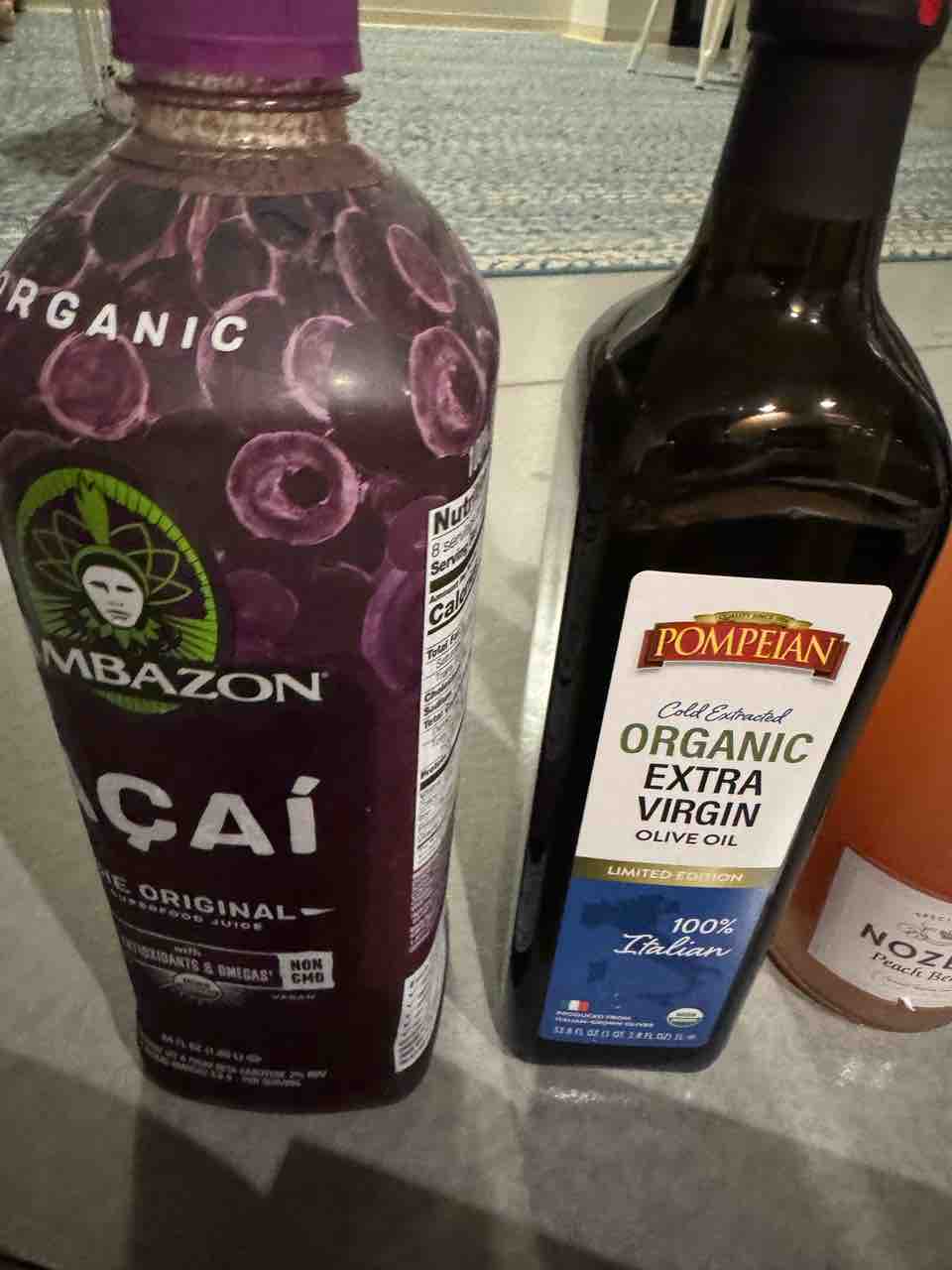 夫のアサイージュースに、オーガニックオリーブオイル。