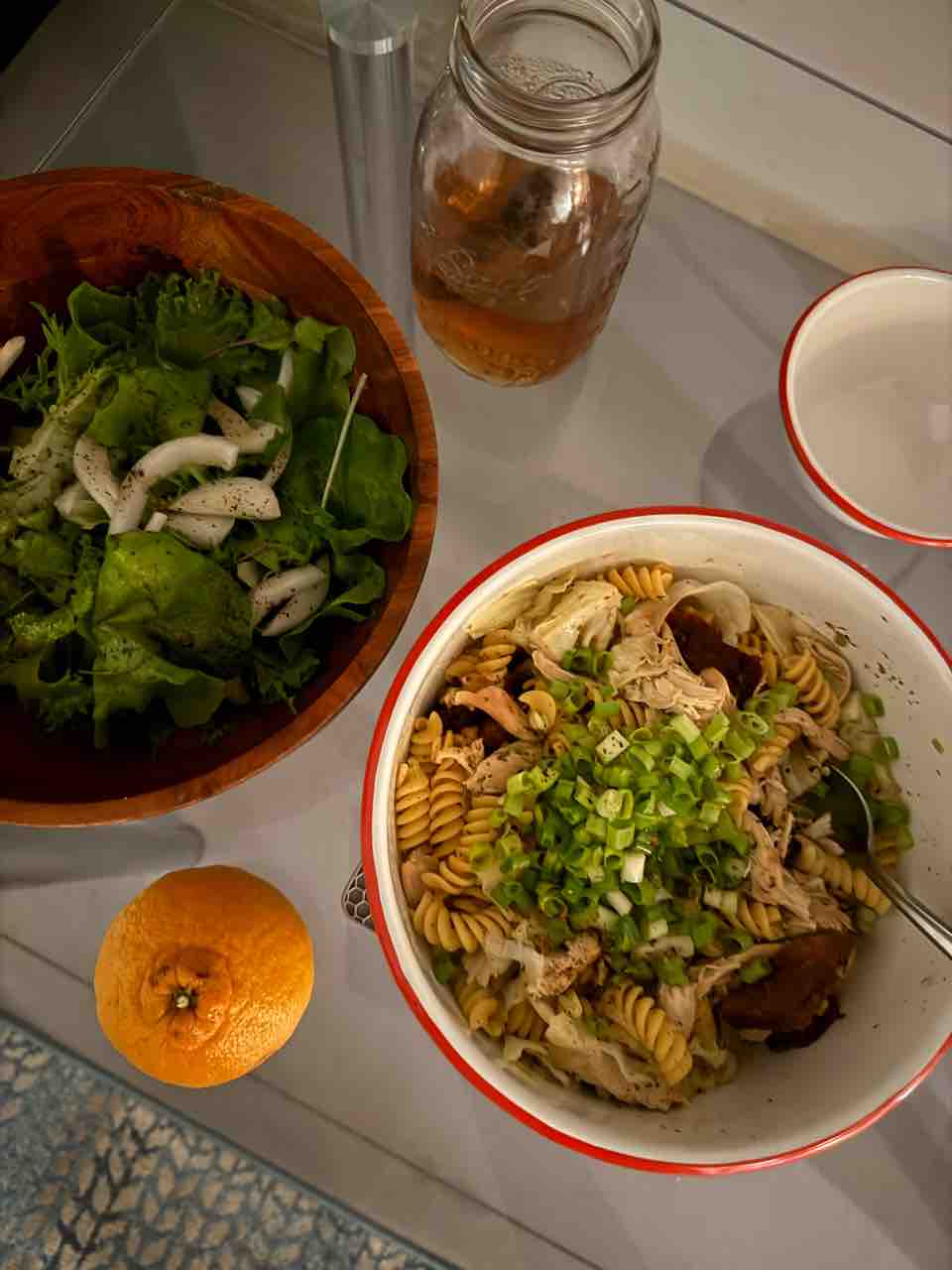キャベツ、サンドライトマト、ロティサリーチキンのパスタ。和えるだけで簡単なのに美味しい!
