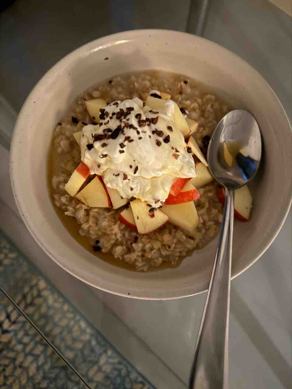 朝はオートミールを煮て、りんご、ギリシャヨーグルト、カカオニブを載せたもの。