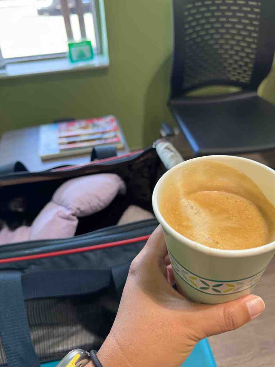 私は腹ペコすぎて、待合室でラテを飲む。