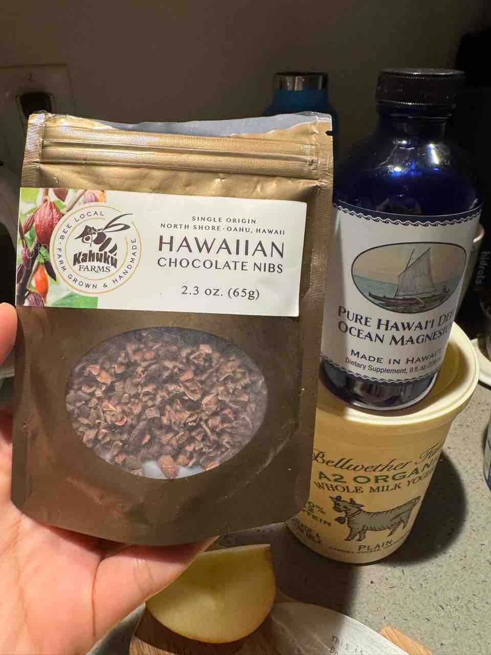 お水にはマグネシウム入れて、ヨーグルトにはカカオニブをかけて。