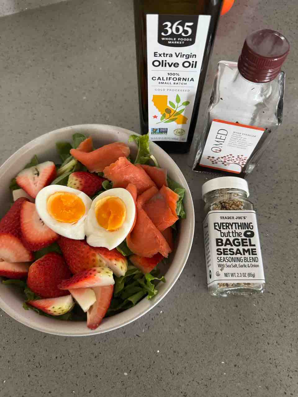 サーモンとイチゴとゆで卵に、オリーブオイルと、レッドワインビネガー、ベーグルシーズニング〜!