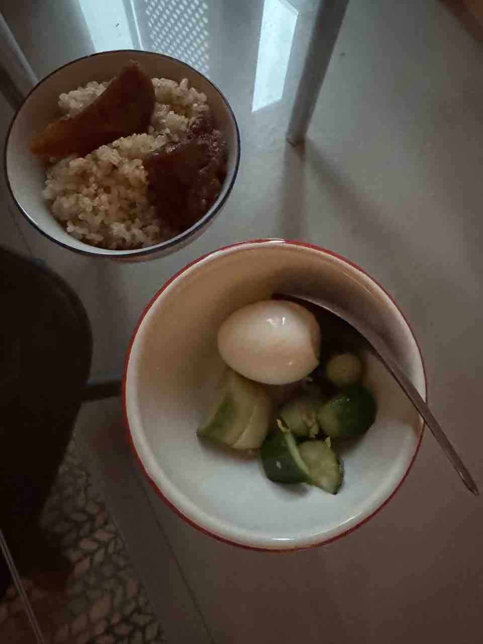 朝は玄米にカラスミと、鶏レバーピリ辛煮。ゆで卵ときゅうり。