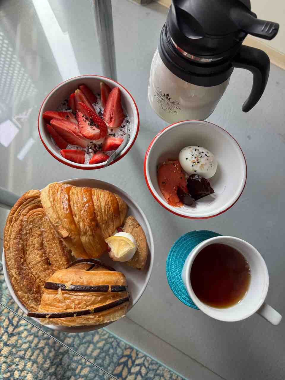 パン山盛りと、ヨーグルト&チアプディングにいちごとカカオニブ、ゆで卵とサーモンとビーツ。