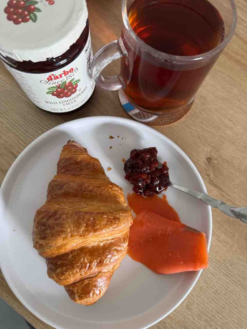 ランチその1はクロワッサンとスモークサーモンに、リンゴンベリーのソース!