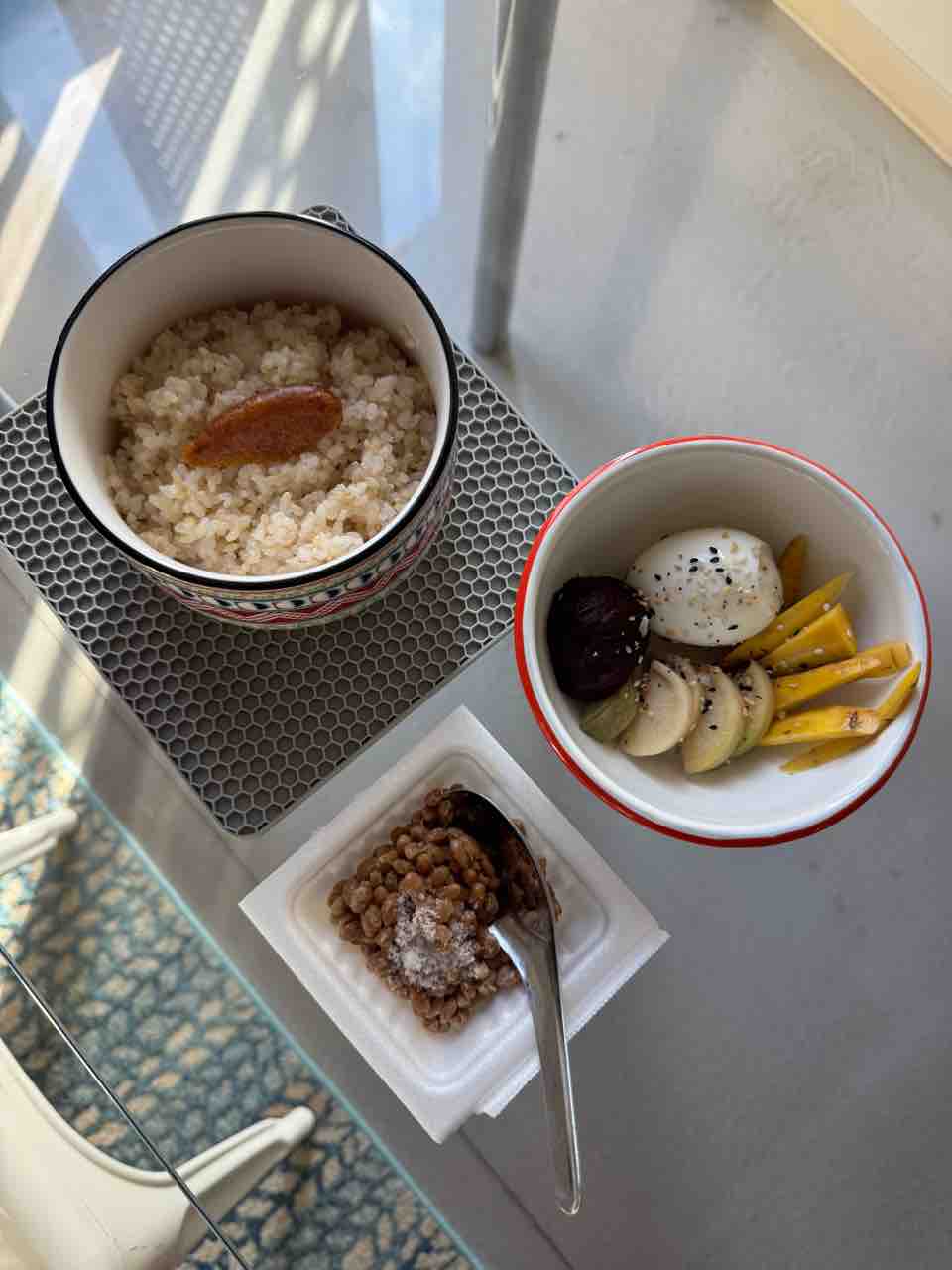 糠漬け、ビーツ、ゆで卵。納豆。