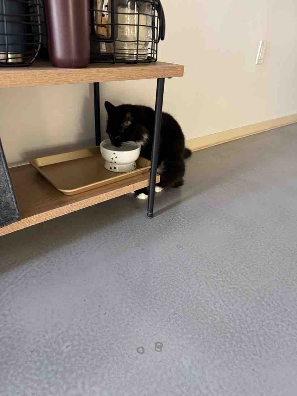 とりあえず、棚の下段に載せてみた。何気に飲みやすそうだし、床より良さげ。