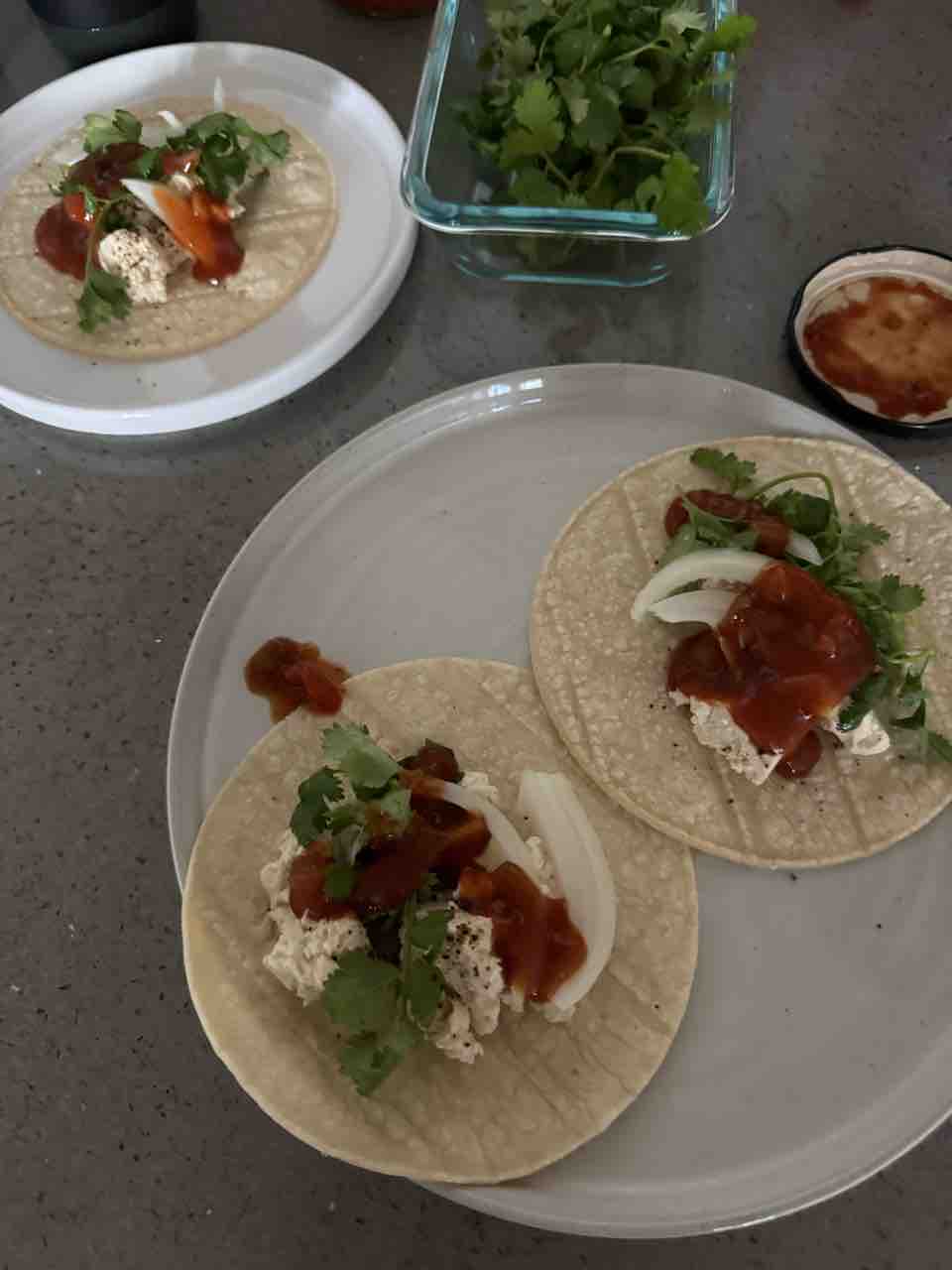 適当タコス。蒸した木綿豆腐を適当に崩して、野菜とサルサ載せただけ。