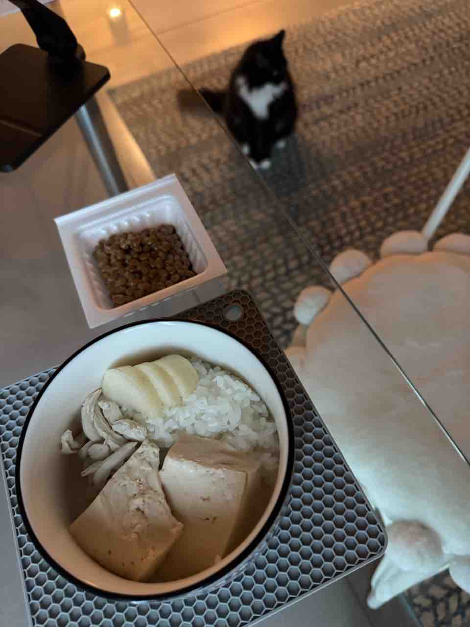 朝の手抜きご飯。冷やご飯とお豆腐、猫用に作った鶏胸肉とチキンスープを拝借して器ごと蒸し器で温めたやつ!それに糠漬け&納豆。美味しい。