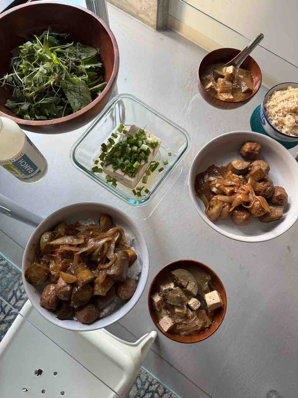 人間たちは鶏肉のミートボールをなすと玉ねぎと味噌炒めにしたやつ。