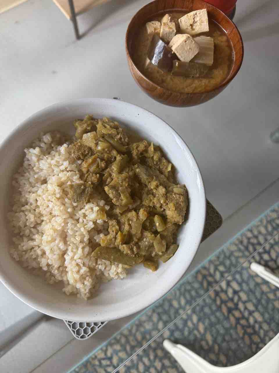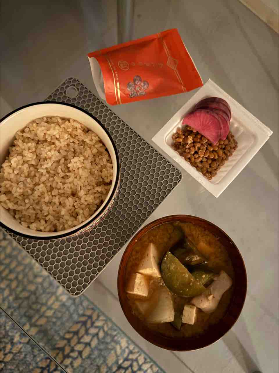 朝は玄米に、味噌汁と納豆と糠漬け。