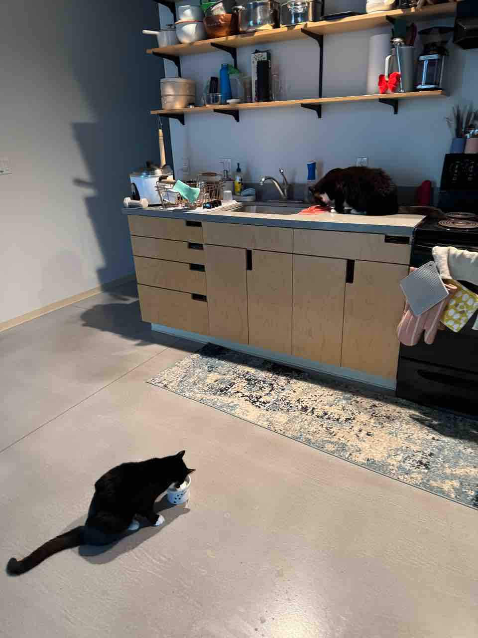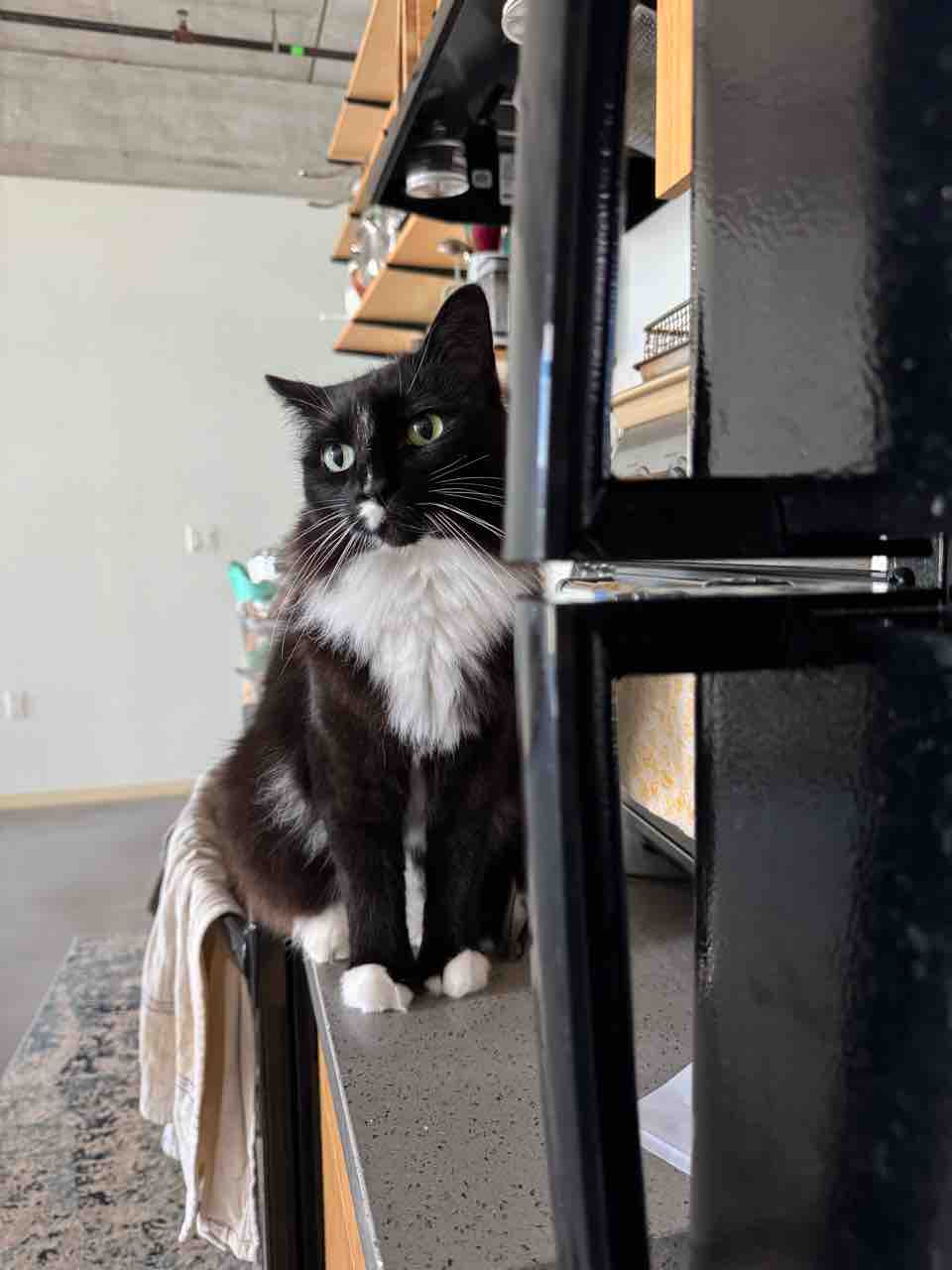 冷蔵庫に猫様たちのご飯が入っているので、ポチ姫は定位置で無言の催促よ