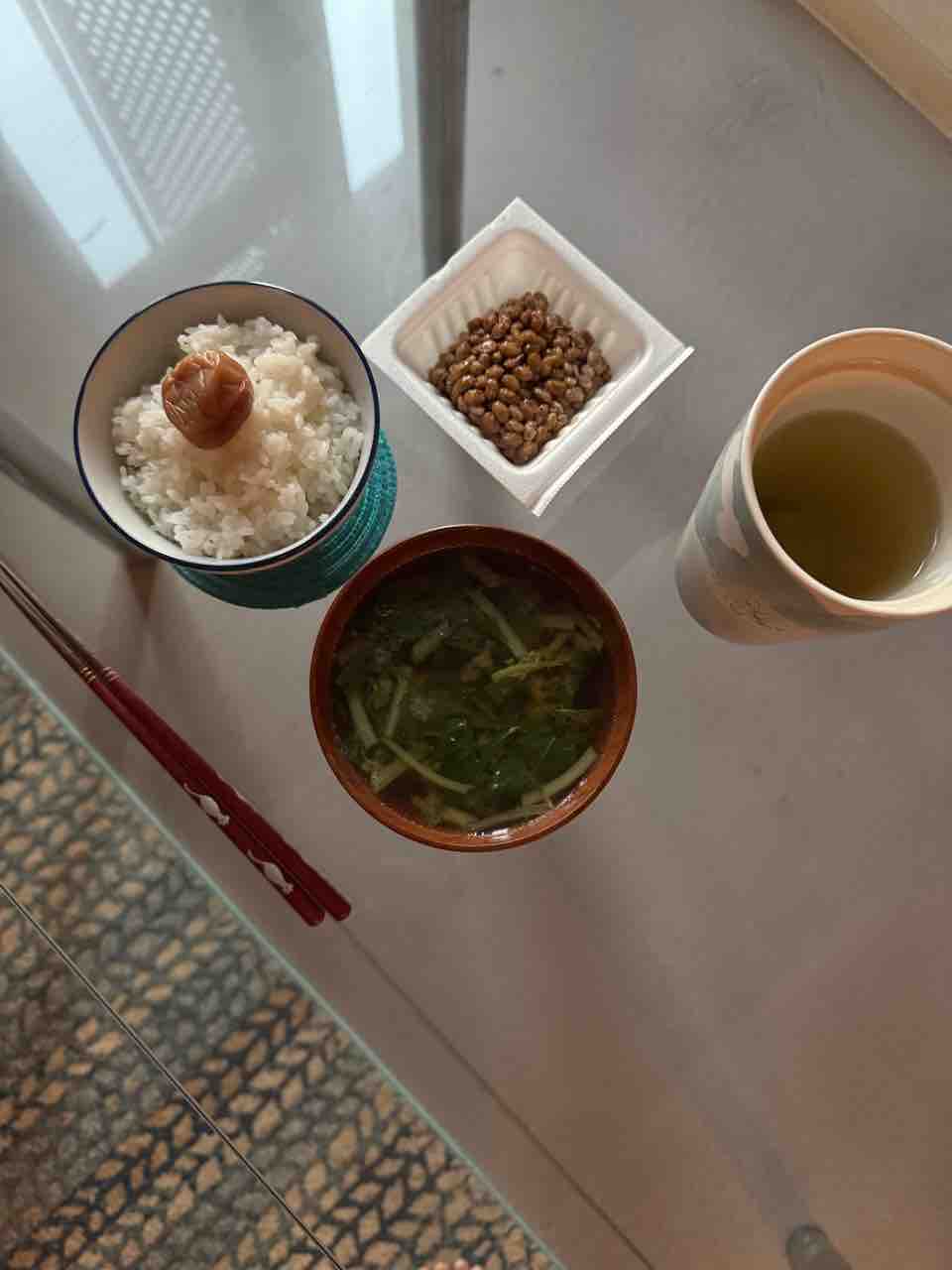 朝は梅干し、白米、納豆、水菜と鶏肉の味噌汁。玄米茶。