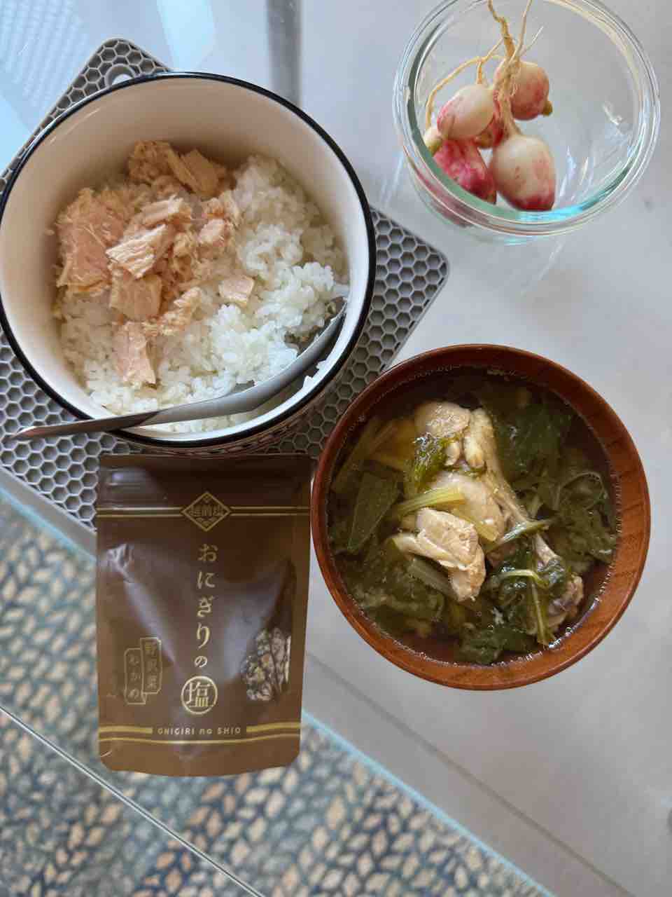 朝の味噌汁、白米にツナ水煮とごま油ちょろり、ラディッシュの糠漬け。